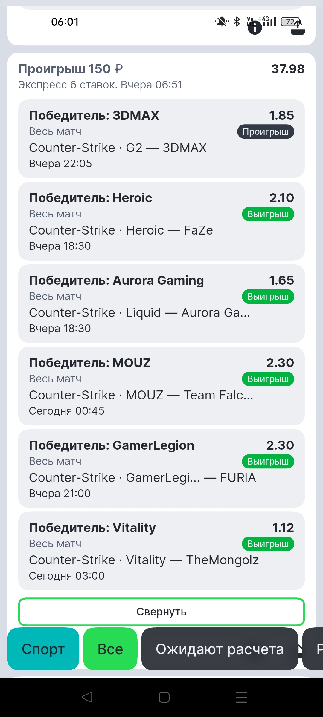 Четко предсказал >>805733 Все зашло К сожалению я как-раз подрезал средства расходуемые на экспрессы, так бы озолотился. Но неплохо-неплохо, +6к, и если завтра Виталити c форой -5.5 победит то капнет еще 8к с экспресса за 300 рублей. Я думаю победит, Монголы осилили Фальконс только потому что там два лучших игрока на жопе ровно сидели и ничего не делали.
