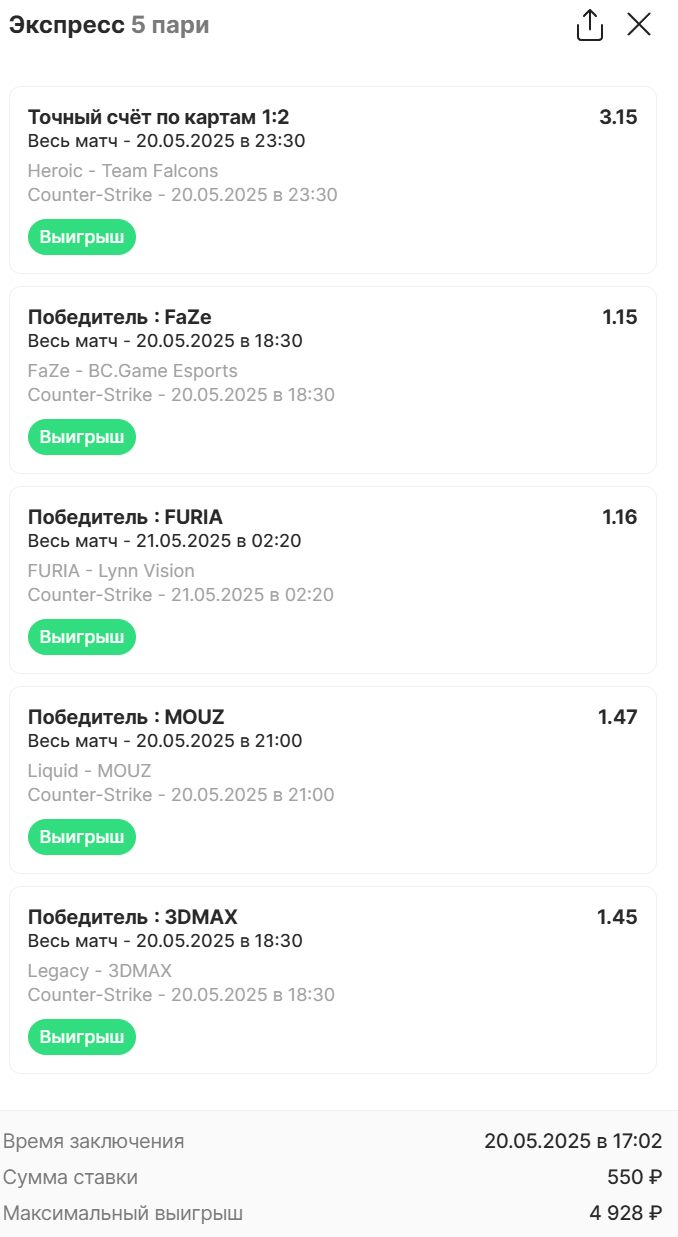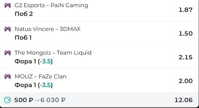 Получилось плохо, 50% угадано, надо повышать качество вангования 1. Mouz 2. Nip 3. Faze 4. тут хз, вероятно Спирит, но кэф у него неоправданно низкий, лучше ставить на аврору с большой форой 5. G2 6. тут тоже что со Спирит, кэф на Falcons слишком низкий, они скорее всего победят, но сегодня они обкакались, а Фурия наоборот жестко выбила Австралийцев.