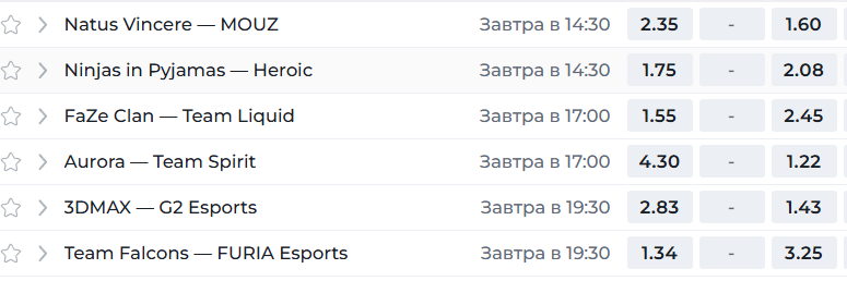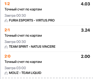 На завтра как-то уже тяжело. Navi - Nip Вероятно нави, но вообще хз кто. Кэф на Нави слишком низкий, лучше брать фору на нип. Вообще не уверен что нави затащит нипов. Faze - Aurora Тоже самое что с нави Mongolz - Vitality Виталити, вероятно 0:2. Единственный довольно очевидный для меня матч. G2 - Furia Удивительно, но здесь кэф у фурии выше, а я думаю у фурии больше шансов Mouz - Spirit Вероятно мауза, но тоже хз
