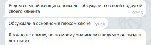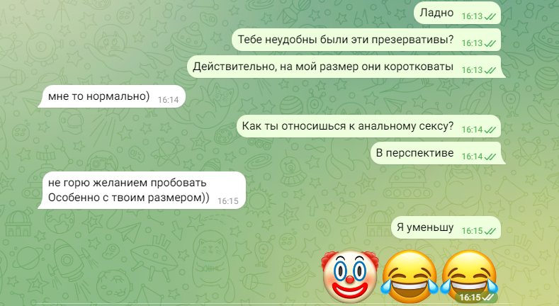 И собственно, это единственная реальная причина почему я тебе не написала в тг и вряд ли напишу. Потому что я не хочу блять получать в личку сообщения о конче разлитой до горизонта. О "натягивании" женщин в машинах. О говне и нюхании пизды и прочем. Уж извини, мой хороший, мои ориентиры - нечто большее чем это.