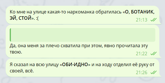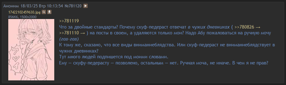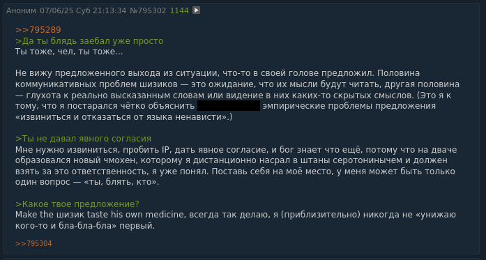 И вообще. Я хуй знает, к чему приурочен этот пост. Я никакой агрессии не транслировал последние 10 постов, и уж тем более ничего о сексе не писал, не говорил. За что ты меня обкакала? За что ты блять на меня наехала? Эта тема была обсосана месяц назад, почему ты подняла ее сейчас