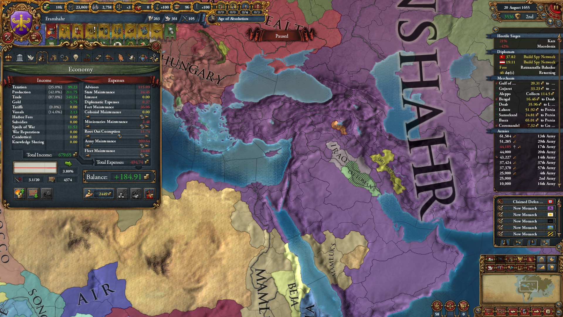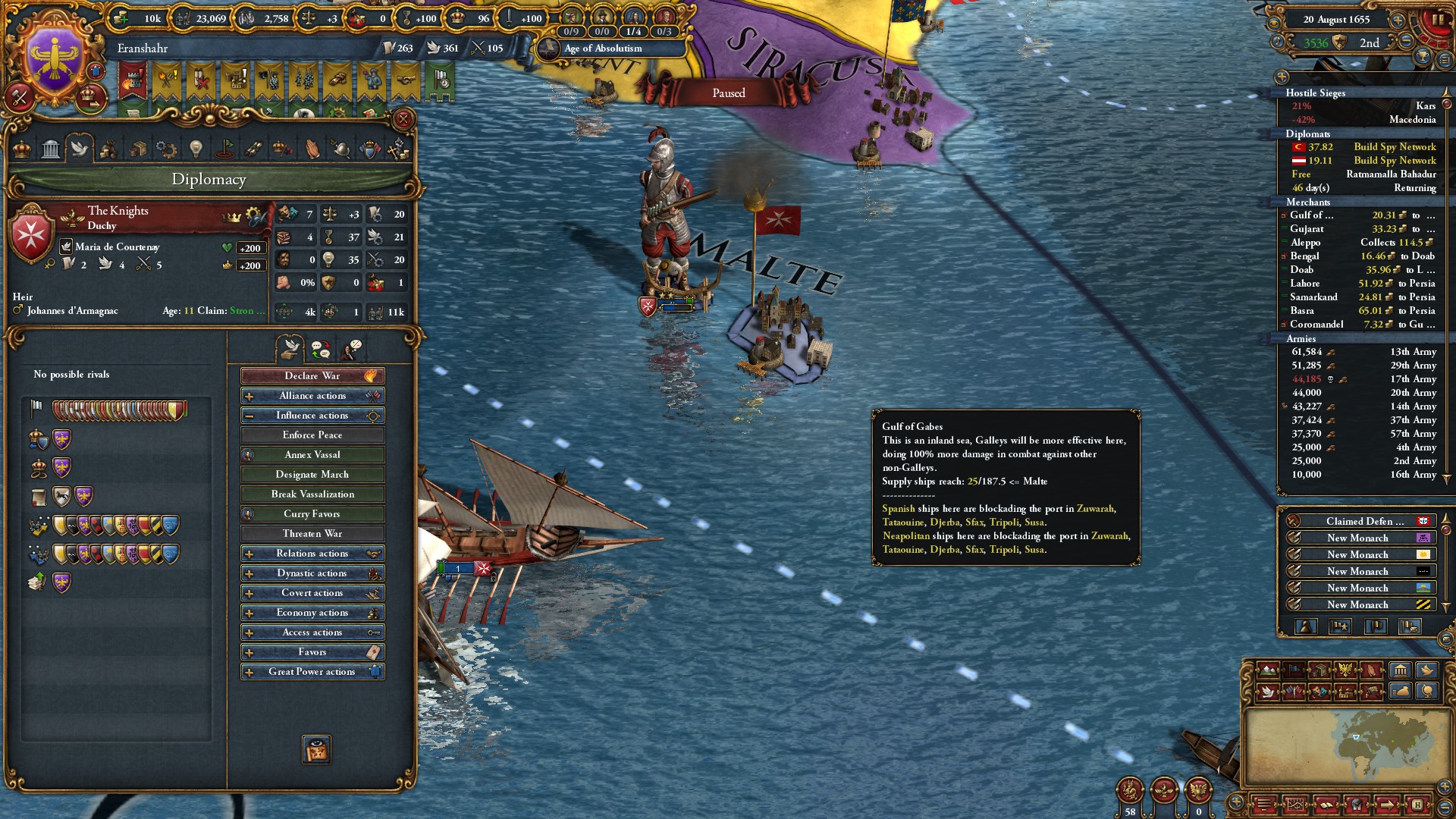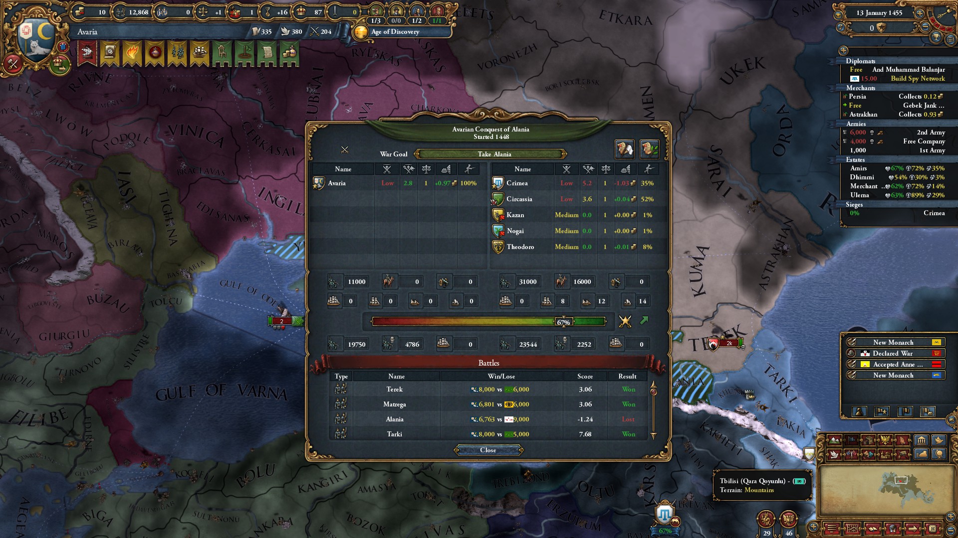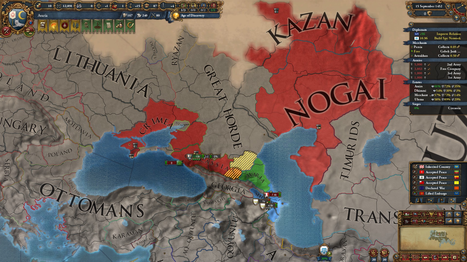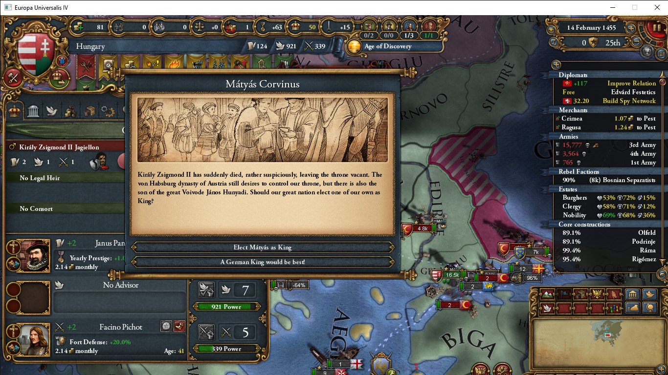 Знатно обогатились за счёт осман на ~650 монет у каждого... В этот раз я забыл убрать апостолическое королевство, но унии тем не менее избежал. Видимо избрание Матьяша королём заскриптовано. Вики пишет, что он был первым ренессансным правителем восточной Европы, покровителем художников и архитекторов... Хотел быстро развести Австрию на войну с Венецией, пока действует историческая дружба, но успел их использовать только против осман. Пока мы ещё в союзе, но из совместных войн они уже начали выходить (зато это позволило не делиться с ними по договору). Нашёл, что на пик 2 отображается, кто поддерживает независимость вассалам. Вот только непонятно, увеличивает ли поддержка "желание независимости" или нет. Если отношения с вассалом выше -25, то поддержать независимость якобы нельзя.