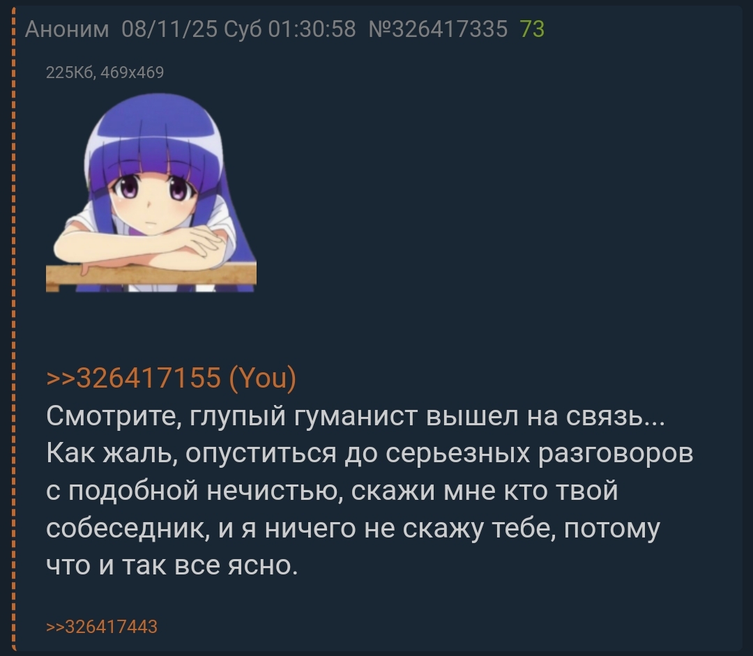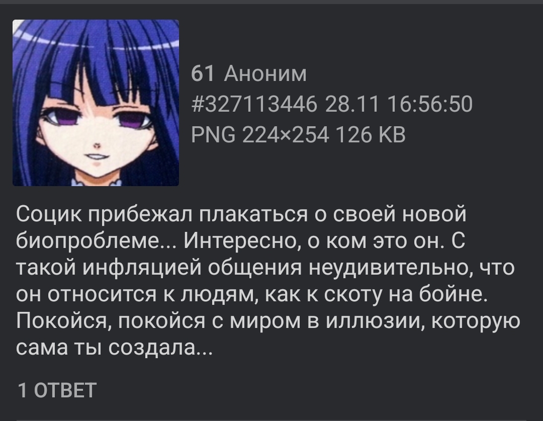 Тред анона, который хотел свалить от мамкобабки в Новосибирск и больше не возвращаться к ним, а так же по совместительству тред обсуждения игр/визуальных новелл/аниме-сериалов. Всё началось с навязчивых тредов в /b/ с списком вещей, которых я никогда не делал в своей жизни (оп-пик 1), которые в свою очередь бампались мной аниме-картинками и записями с мамиными криками. Аноны расспрашивали меня о жизни, постепенно начал выполнять пункты из списка и неоднократно стала подниматься тема сепарации, которую я со своей стороны поддержал. В данный момент нахожусь в Новосибирске, где работаю (за 30к) и арендую (за 21к), осваивая самостоятельную жизнь. О себе: сыч-омежка с девятью классами образования и опытом работы дворника, был травим в школе, умеренно всрат, картавый войсцел-заика, умею читать на английском, не листва (было лишь с шлюхой), не курю, не пью, низкий социальный интеллект, в депрессию не верю, тохофаг, ношу очки, люблю играть в игры, смотреть аниме, спать с дакимакурой, проходить визуальные новеллы и слушать рок-музыку, не имею интереса в программировании.