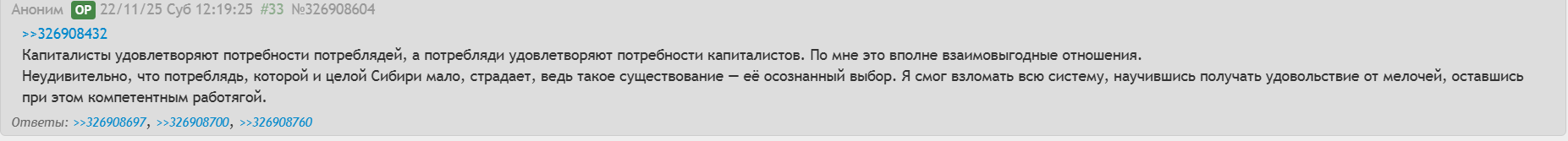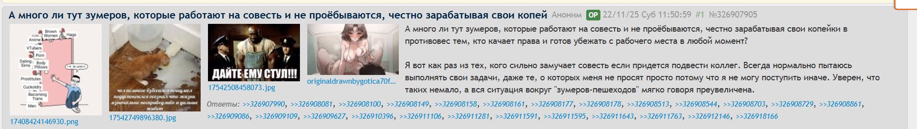 ПОИСК РАБОТЫ С конца августа начал искать работу, возобновив поток тредов. Перечисляю самые значимые попытки. 2023 Пошёл на завод три раза — не взяли. С автомойки не перезвонили на счёт стажировки. Простажировался пару часов в вайлдберриз, сказали что позвонят — не позвонили. На собеседовании на должность продавца в магазине алкоголя, отвечая на вопросы и предупреждения о том, что "работа тяжелая", я спасовал и сказал что мне это не подходит. С другого завода отправили на медкомиссию за свой счёт, а у меня не было денег. Три дня стажировался без оплаты на мерчендайзера в магазине — сказали, что не подхожу. Придя по вакансии оператора видеонаблюдения, пару часов пялил в монитор вместе с Ерохой, который тоже хотел на эту работу. На следующий день звоню женщине, номер которой мне дали днём ранее — "Номер больше не обслуживается". Случайно побывал на брифинге сетевого маркетинга (тянши-хрень), где вместе с пенсами слушал охуительные истории про большие бабки. Пошёл на другую вакансию оператора видеонаблюдения в сеть магазинов, но меня определили в один из самых далёких от моего дома. Не стал там работать. 2024 Проходил стажировку в пункте выдачи заказов, но я рассеянный даун-аутист обосрался c материальной ответственности и чуть не попал на бабки. Ушел оттуда. Собирался пойти работать официантом рядом с домом, однако мне в том месте по телефону сообщили что какие-то быдлостуденты оказались ушлее меня. На свой день рождения у меня было в планах пойти работать официантом уже в другое место, но меня отговорила маман. Пришел устраиваться сборщиком заказов, но там требуется самозанятость. Пришел устраиваться баристой, но там требуется медкнижка.