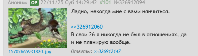 Ответы на распространенные вопросы: > тебя наебывают нормилахта/капиталисты, от самостоятельной жизни тебе только больше вреда будет От одного лишь голоса мамаши у меня дергается глаз и этот частный дом, в котором я живу с ней, мне вообще не нужен. Можно и попробовать... > начни получать пенсию шизофреника В прошлом году я корчился от таблеток в дурке ради этой идеи, в итоге шизу не диагностировали. Больше никогда туда не вернусь. > какой диагноз? В глаза не видел своей справки, мама говорит что у меня аутизм, но я считаю, что это неточно и это был всего лишь предварительный диагноз. В военном билете я записан как "В"-шник. > почему мама мыла тебе голову в 25 лет? Так было еще с сосничества и продолжается до сих пор. Моет мне голову над раковиной, никогда не слышал чтобы она говорила, что это как-то неправильно. > чем ты тогда питаешься? Макарошки с пюрешкой, гречка, дошираки, бурурброды. > в смысле не мылся в душе? Моюсь в большой пластиковой бочке. > чем ты тогда занимался всю жизнь? Читал энциклопедии, учился, фантазировал, разговаривая вслух сам с собой, смотрел мультики, играл в самодельные игрушки и в компьютер, мои сверстники и их жизнь мне не были интересны. А потом наткнулся на двач... > иметь девушку будет полезно и найти несложно... В падлу, пробовал общаться с ними в Интернете. Так выяснил что разговоры с ними меня сильно выматывают морально. > в чем смысл треда? Вниманиеблядство и постинг миленьких картиночек. Добро пожаловать!
