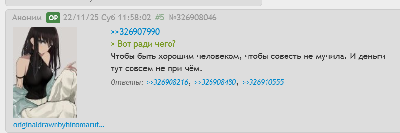 >>830557 >Впрочем, в этом что-то есть. В этом есть свой интерес, когда включаешься в поиски, а потом наблюдаешь, куда они тебя приведут. Какие источники? У меня пара пиков была с этого сайта: https://bobopic.com/85080229.html Вот какой-то сайт в закладках с галереей Шион https://gall.dcinside.com/mgallery/board/view/?id=higurashi&no=346715 Архив твиттера с рисунками персонажей на фоне реальных фотографий https://web.archive.org/web/20190723111625/https://twitter.com/madatohi Много есть помимо этого, но в основном конечно смотрю и сохраняю либо непосредственно при постинге, либо когда чувствую, что запасы картинок для постинга на исходе и можно пополнить коллекцию. Хотя у меня уже около тысячи накопилось и не всё выкладывается, может стоит пересмотреть запасы и отсортировать >Видел ещё некоторые сайты с видео, но там регистрация нужна. Что за видео? Ссылку...