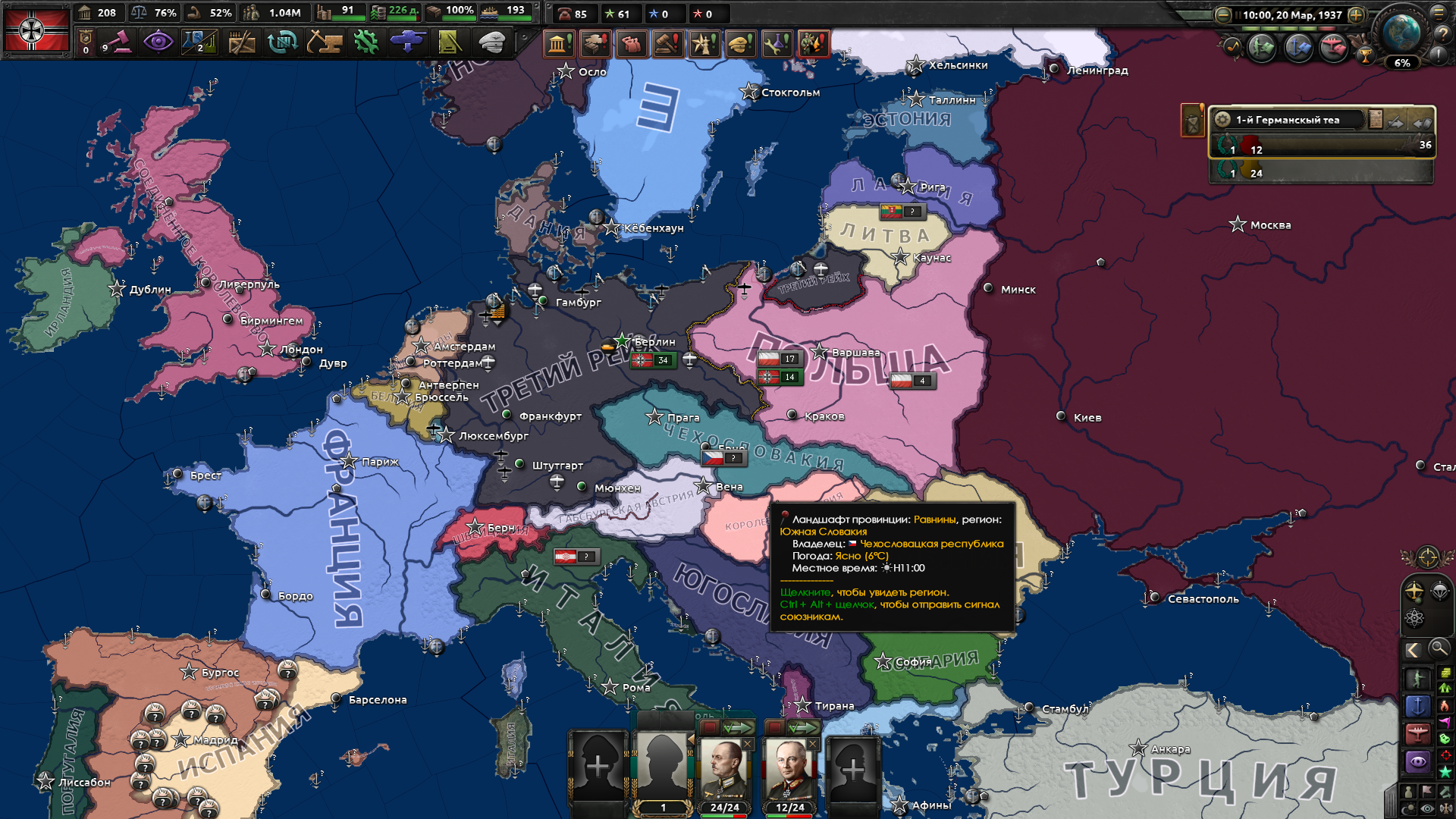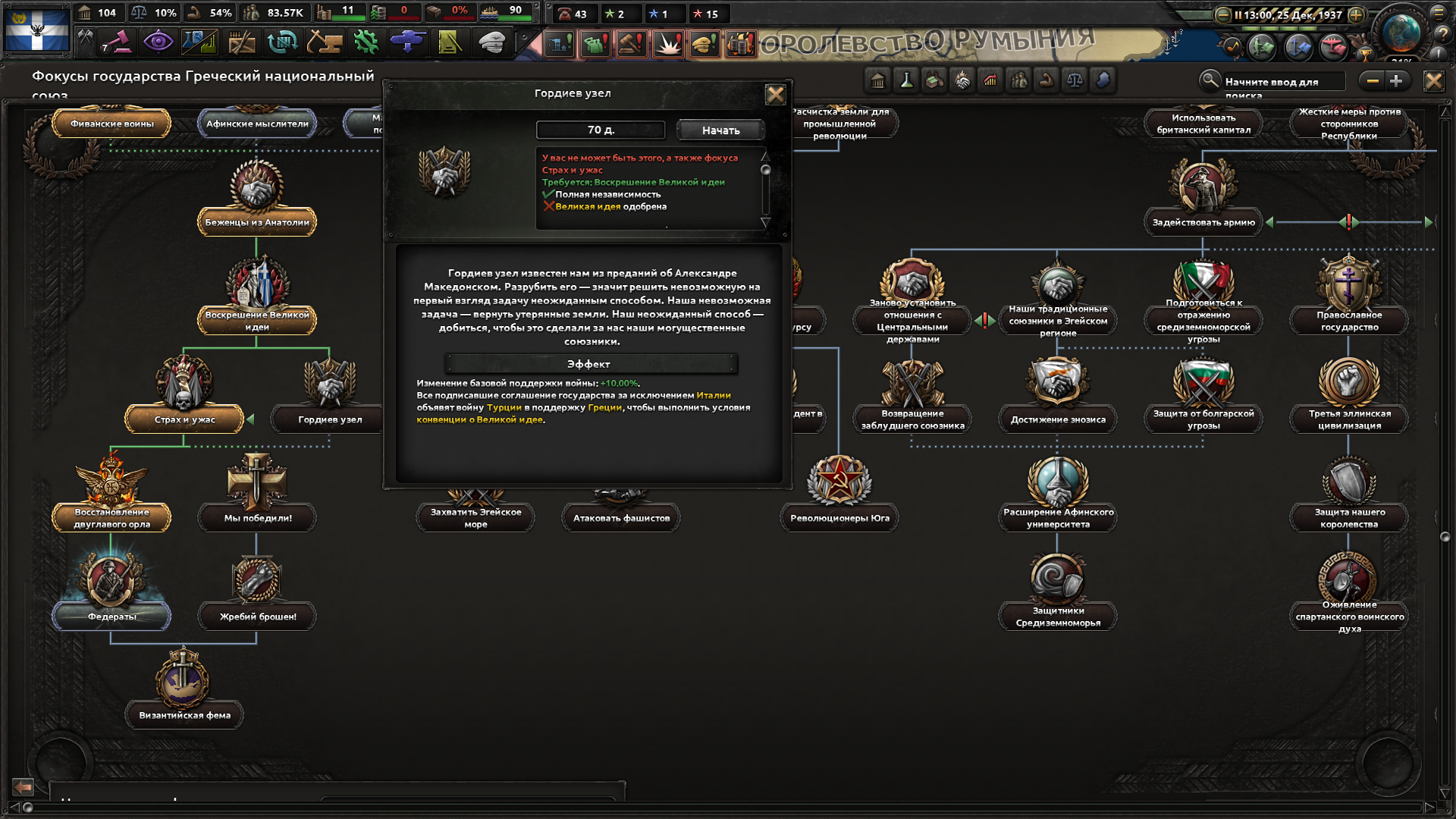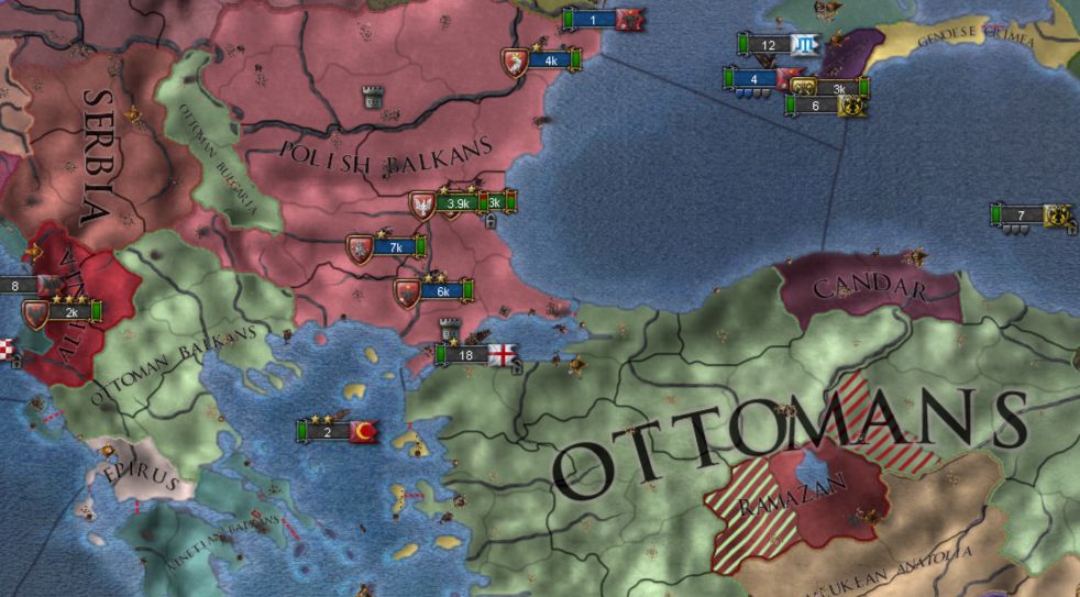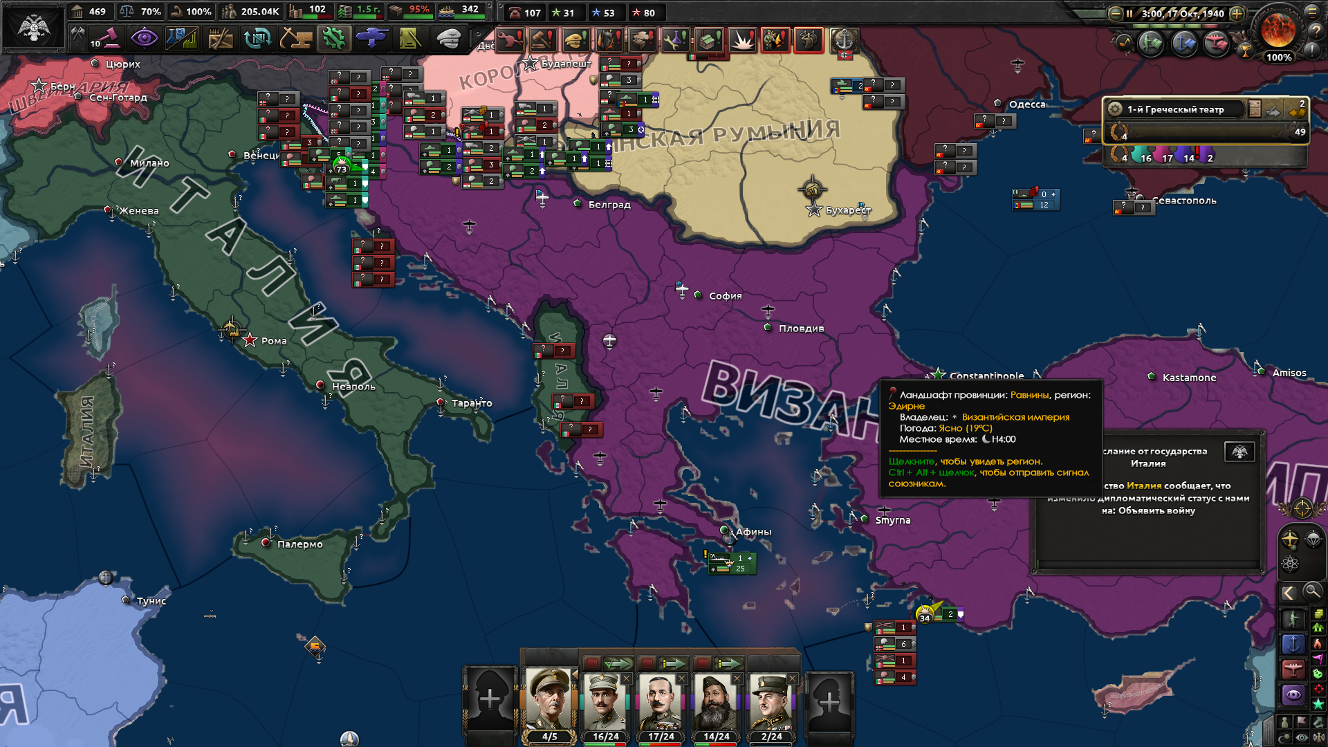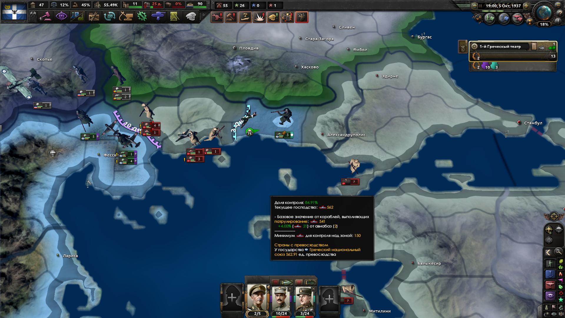 >Не можешь пробить Конст? Нет. В начале игры за Грецию у тебя 13 дивизий и никакущая промка, пока ты не выполнишь экономические фокусы. Но войну Турции ты должен объявлять как можно раньше, поскольку в 37м году создаётся альянс Союзники, куда Турция обязательно вступает после объявления ей войны. Я просто стоял на своей границе всеми дивизиями и отбивал бесконечные атаки турка, пока у него резервы не кончились. Я пытался атаковать с двух островков, но там на противоположном берегу стояло 5 турецких дивизий, я бы их не пробил... Я посмотрел, как захватывают турка другие, они позволяют высаживаться ему в Грецию, а потом окружают его дивизии и в котле вайпают. Это можно попробовать повторить, но уже чуть позже...