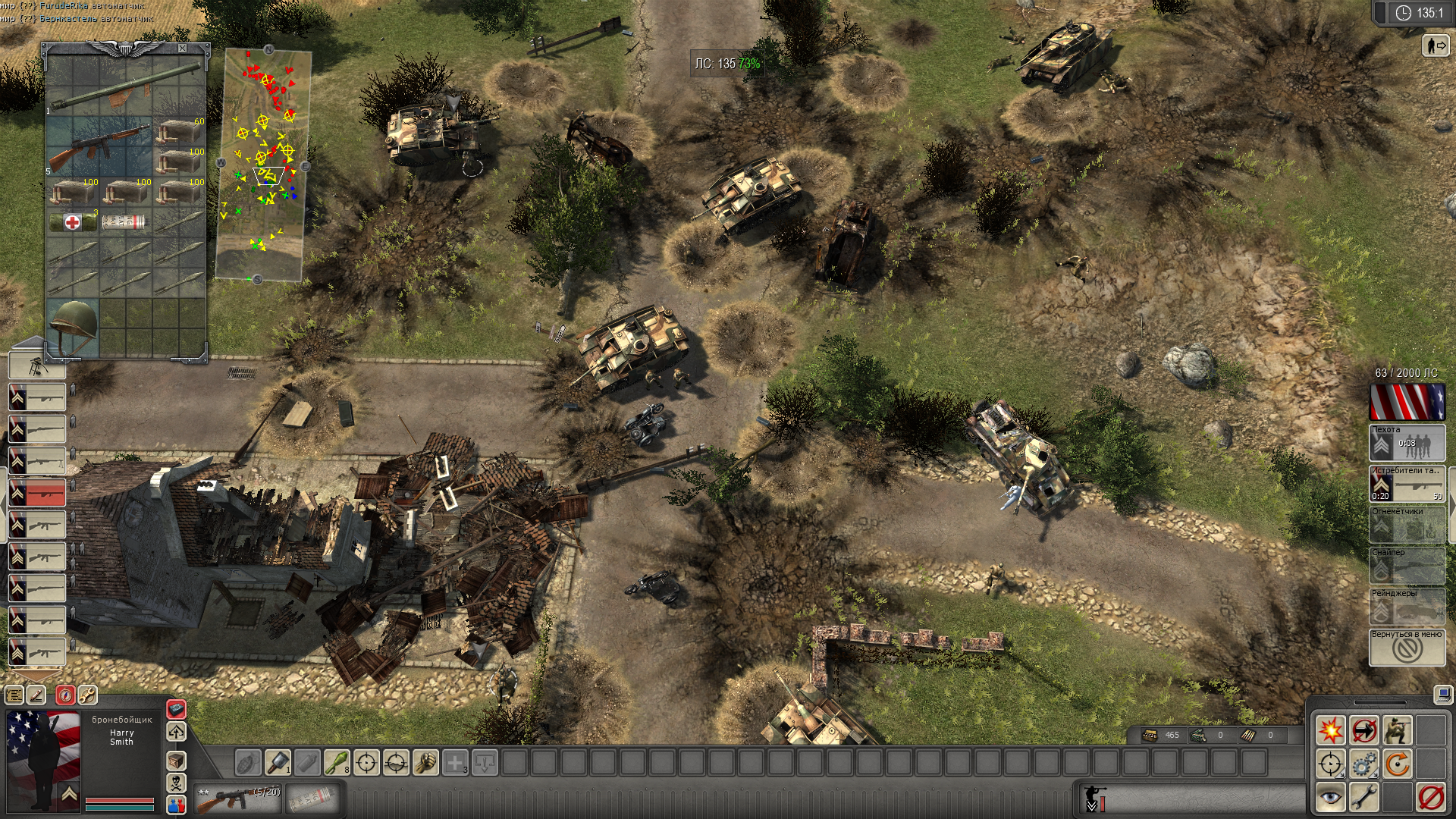 >>830348 >но противотанковая пушка у ручья Если танк и доезжает на расстояние ответного выстрела, он не может пробить этот железный защитный щиток с солдатами, а если и пробивает, то только одного из двух стреляющих убивает. Хотя я не помню какой боеприпас использовал. Может в само дуло выгоднее стрелять чтобы сломать, не пробовал, потому что надеялся затрофеить орудие. На Е можно быстро в прямое управление перейти и выбирать куда целиться и видеть, попадает орудие или ему что-то мешает на пути. Как вариант можно кинуть дым и подползти солдатом, закинуть гранату в ПТР, тогда стрелки умрут, а орудие не пострадает и будет готово к смене хозяина. Само орудие бота неохотно по моей наступающей пехоте стреляло, хотя я из своего стрелял по головам в окопе.
