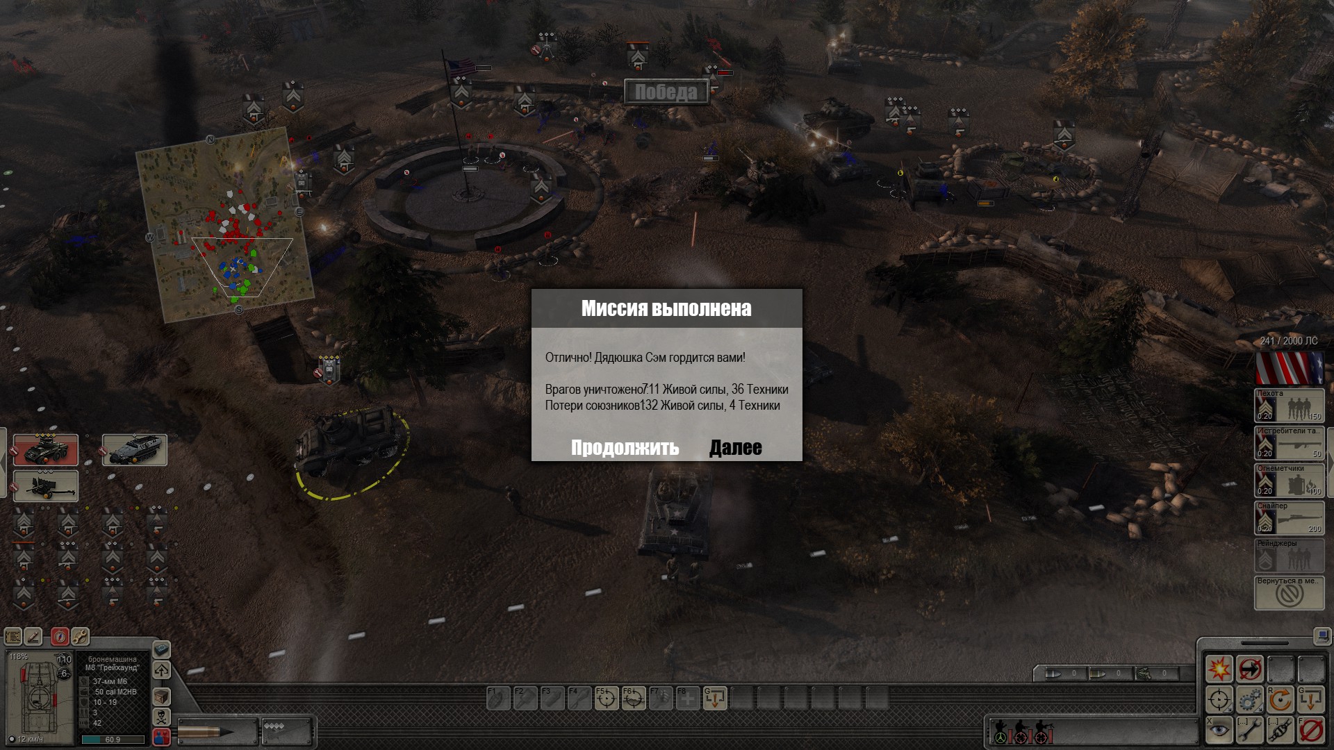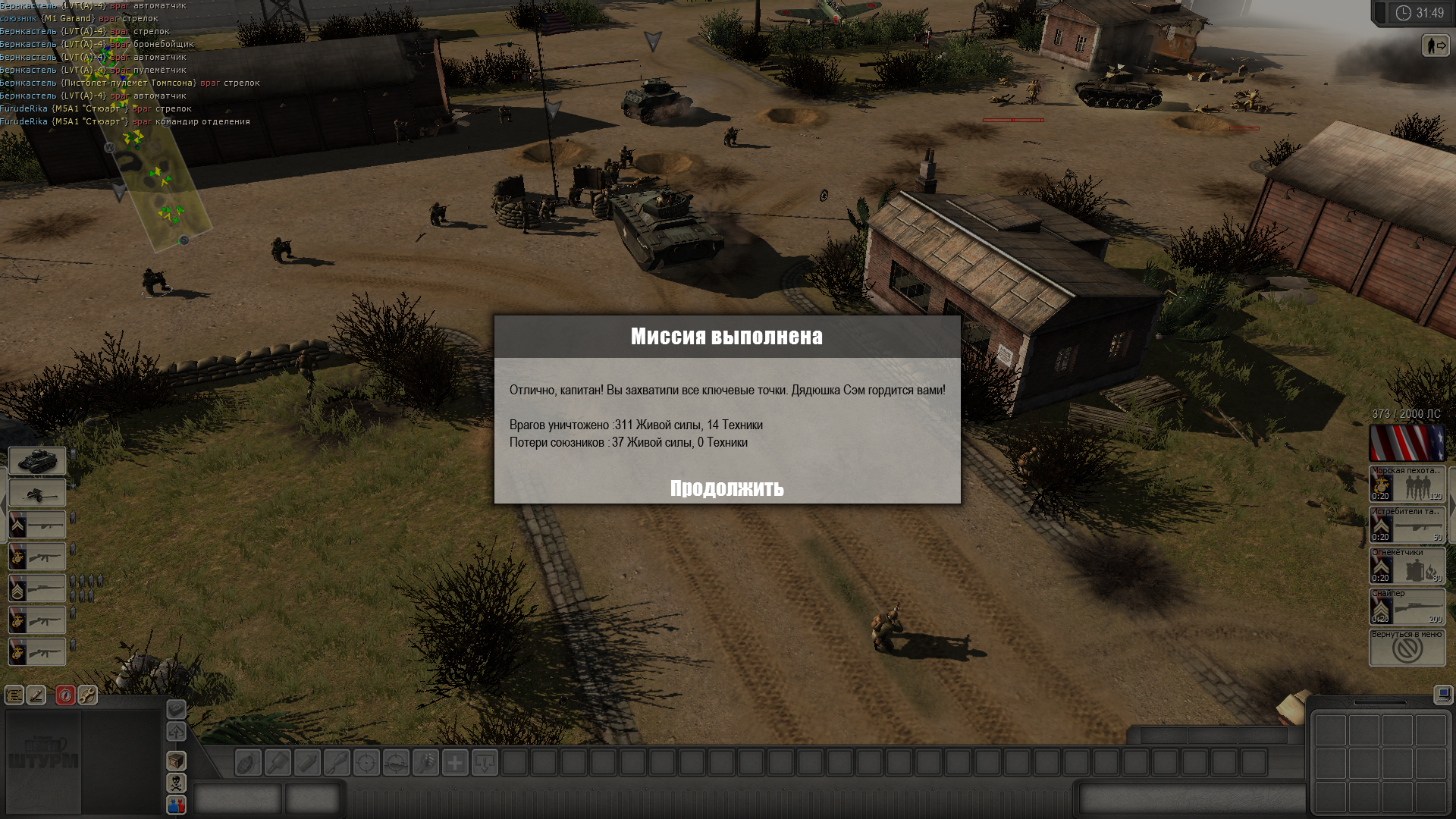 Потратил весь день, чтобы пройти 1 миссию США на максимальной героической сложности. Была куча загрузок, потому что всё начинается с того, что надо 6 солдатами в окопе отразить атаку целой роты 2 бронемашинами без возможности вызывать подкрепы. Потом надо штурмовать укрепленные лагеря почти без подкрепов, а потом еще и держать жесткую оборону в течение 10 минут, когда на тебя прут по 10 танков и сотни пехоты, а тебе очков хватит максимум на один танк за это время.