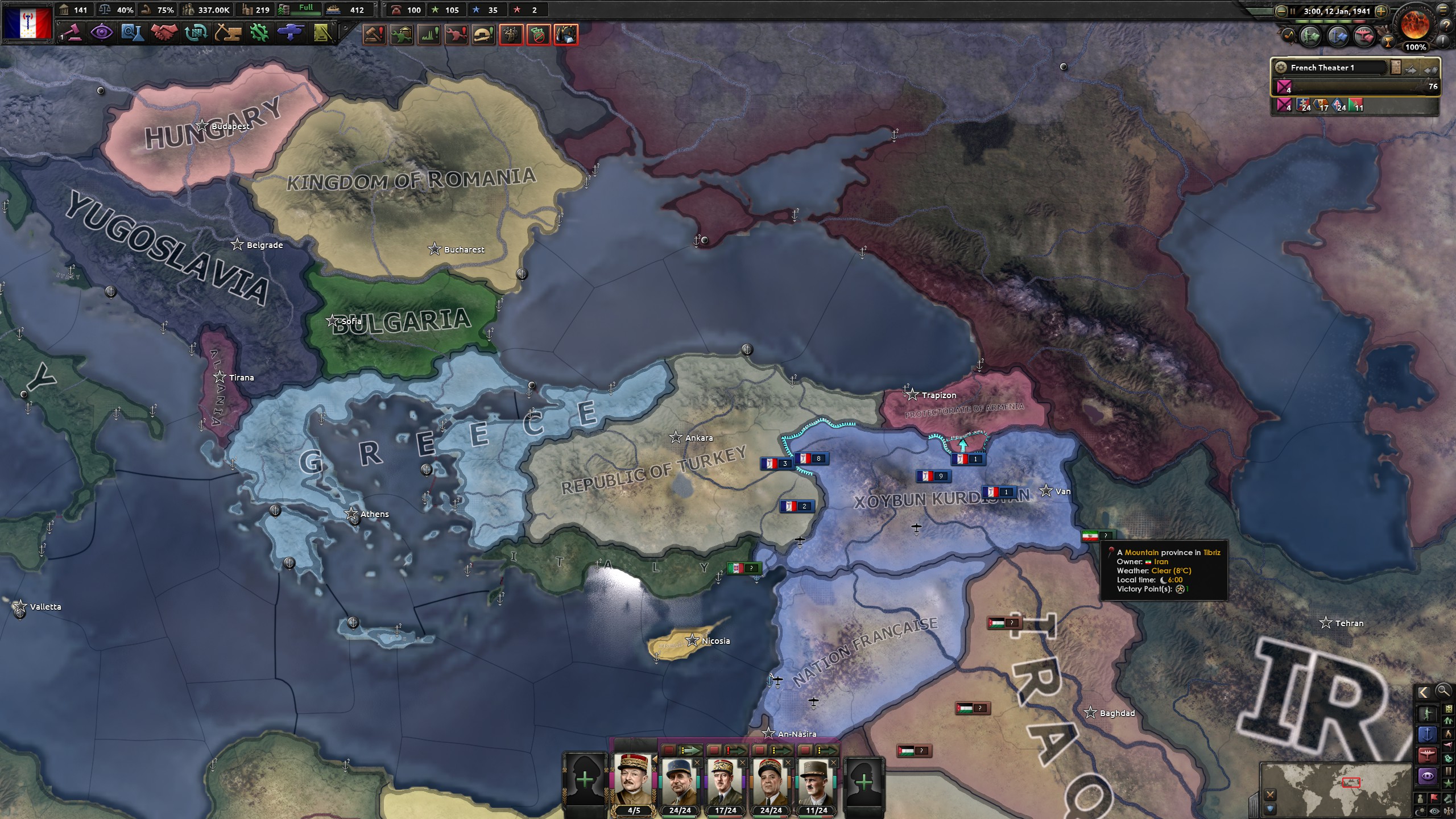 Подсмотрел как делают другие, они позволяют турку взять часть греческих территорий, потом высаживаются под Александрополисом и делают котёл. Легко победил Турцию таким способом. Перед войной с Осью я забыл про фронт в Албании, не прикрыл порты. Германия и Италия меня захватили за счёт этого. Я ещё ради красивых границ не аннексил всю Румынию.