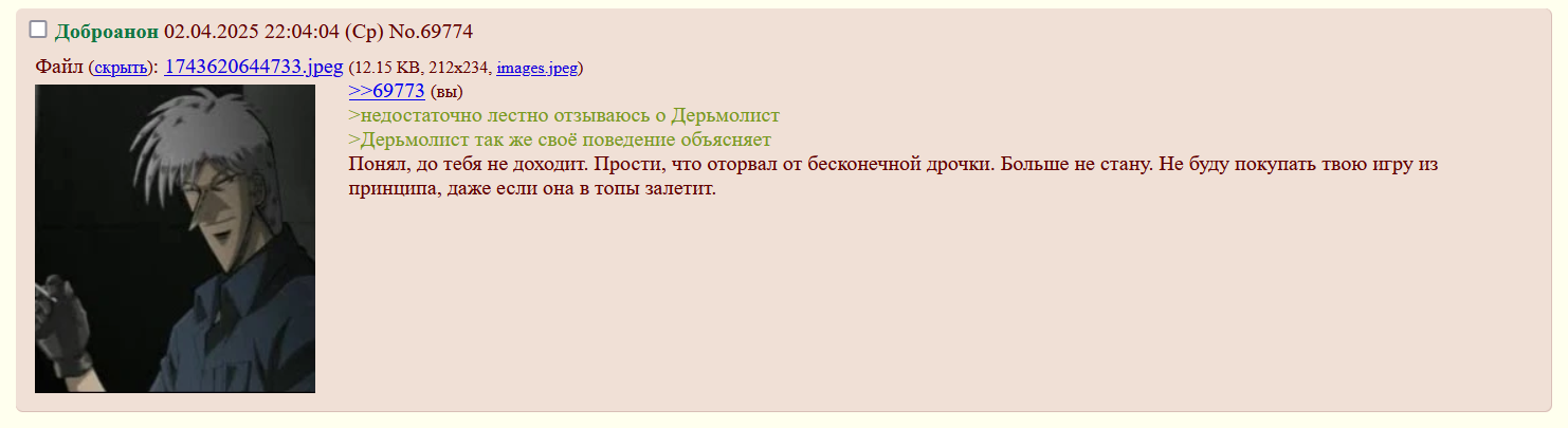 Далее, из-за меня Юки удалил 1 тред тут и еще около 5-6 на доброчане. Конфликт был такойже как и у тебя. В какой-то момент мне стало стыдно что я перегнул палку. Я ему еще в процессе пидоров натравил в личку на сайте гей знакомств, которые прямо в телеграм накидали хуйцов - он удалил тг аккаунт. Мои паладинские чувства простро перешли все мыслимые или немыслимые границы, я виноват, стыдно мне. Я перед ним 2жды извинился и пообещал не поганить треды, ведь все таки он саморазвивается в японском и джаву учит, а мысли которые он пишет в бложике, он будтотвкладывает в них душу, любо читать о них, и о прогрессе. После этого мне удалось с ним помириться общаться на нормальной ноте в рамках личных границ. Хотелось бы чтобы он вернул бложики на бордах, а тут появился ты и начался новый цикл. Вот я к тебе и доебался. Если ты против помириться - хуй с тобой.
