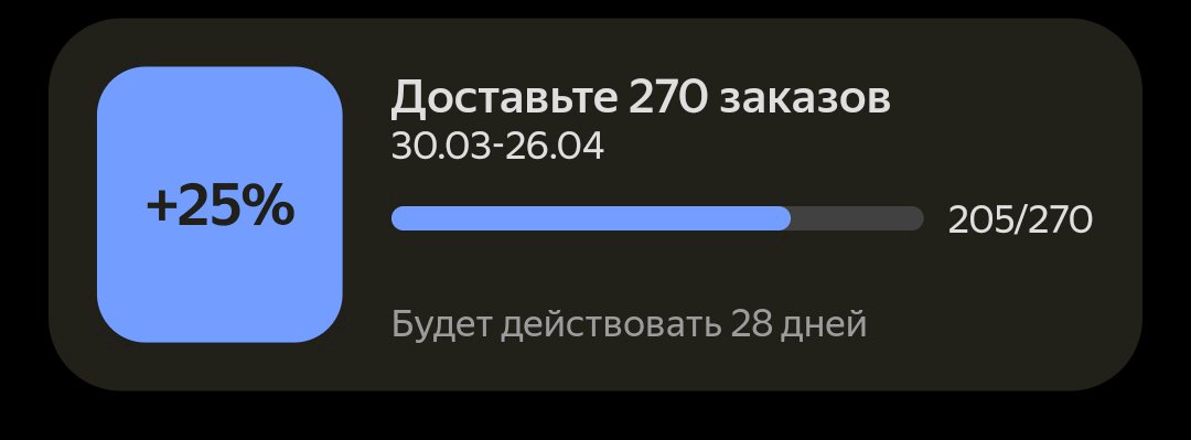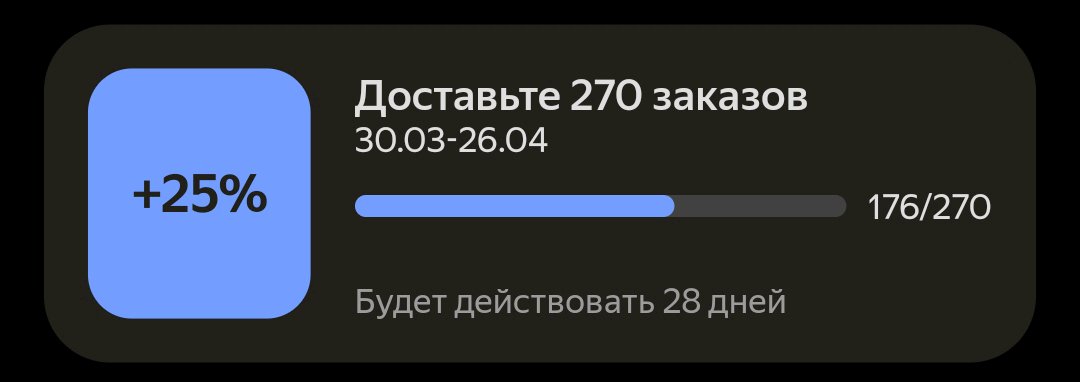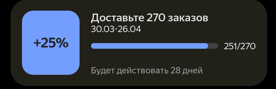 Почти конец слота, сегодня мало выйдет по сравнению с 9 мая, но в принципе норм. Случилось два затыка: сидел 40 минут без заказа на границе зоны, и в одном рестике заказ готовили час почти. Отменять лень было, я сидел в кресле и капчевал. Дали цель наконец-то, два месяца вообще глухо было. 2.5к за 60 заказов за 4 дня. В принципе выполнимо без рванья жопы, главное чтобы заказы были, а их может и не быть в будни...