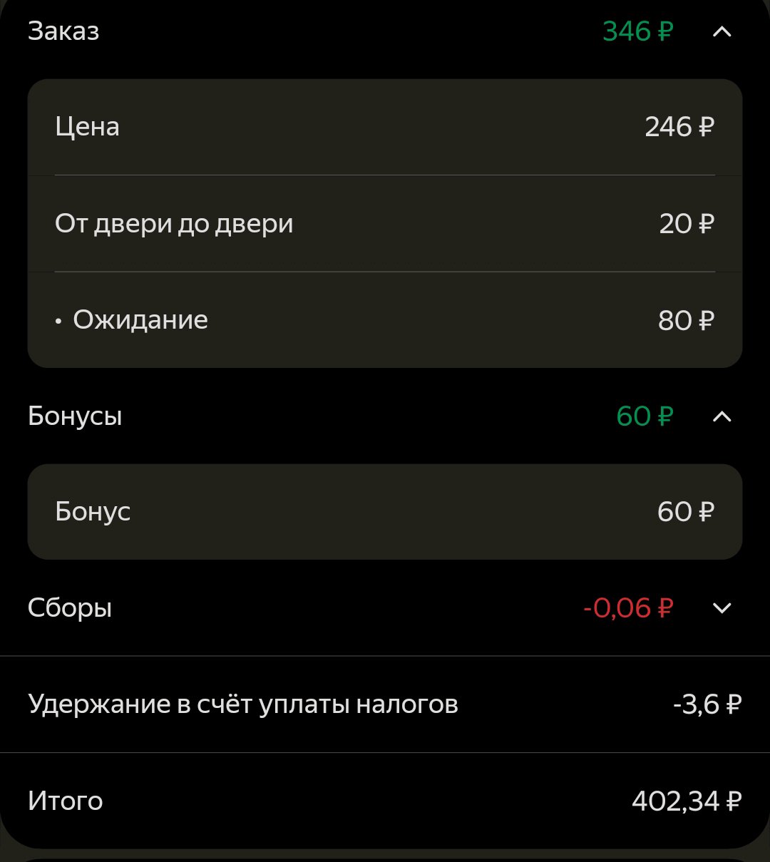 Итак, после обеда переоделся в шорты, потом после пары заказов подумал, что может быть зря, но на самом деле было не холодно даже под вечер, так что всё ок. Почти всю вторую половину слота провёл в одном микрорайоне своего района. В принципе я не против, хотя по бабок там было не очень, много простоев, но в целом было тепло, я сидел слушал подкасты, которые накопились ещё с прошлой недели. Но за 2 часа до конца выпал Мак, до которого километра 4, ну а мне заебись в целом. Доехал, а там ещё не готово. Судя по доплате за ожидание, прождал ещё 15 минут. Взял жрачку и отвёз клиенту минут за 5, но есть одно "но". Позвонил в хату и поднялся на этаж, который был в карточке. На этаже никого, но слышу снизу кто-то орёт. Спускаюсь, смотрю квартира, что указана в карточке 2 этажами ниже, а мужик сонным голосом басит: "Чё опаздываешь?" Я всё ещё в ахуе, что этаж неправильный, ещё переспросил имя у него, говорит да это я, ну передал заказ, и даже на этот вопрос кубанский никак не отреагировал. Тупо лень было объяснять, что я не виноват, что готовят долго, ну в пизду короче. Следующий заказ опять из Мака, в общагу неподалёку. Приготовили кстати моментально, пришел забрал. В общаге 2 двери. Зашёл в левую, а там как будто рай: всё светло, каменда вышла, говорит мне в соседний подъезд надо было. Захожу в соседний, а там литералли ад: навстречу какой-то алкаш пиздует, воняет калом каким-то и мочой. Возле падика тусуются зумеры, хорошо что сейчас не 90-е, а то меня отпиздили бы и обоссали за то что я просто мимо крокодил. Больше ничего интересного не случилось, я просто проставил режим "по пути" домой, словил заказик и закончил слот.