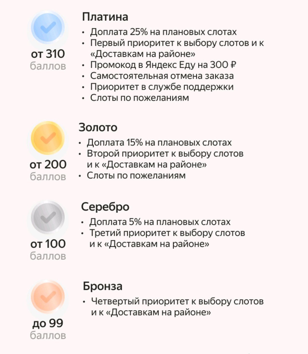 Ну всё, долбаёбы высрали какую-то новую хуйню, теперь надо 100 заказов в неделю херачить, чтобы было +25% за плановый слот, хотя по пожеланиям он был всегда такой. Золото поддерживать можно, это 70 заказов в неделю, я в принципе так и катаю, может чуть больше. Короче хуета какая-то, пусть в аду горят черти из хуяндекса.