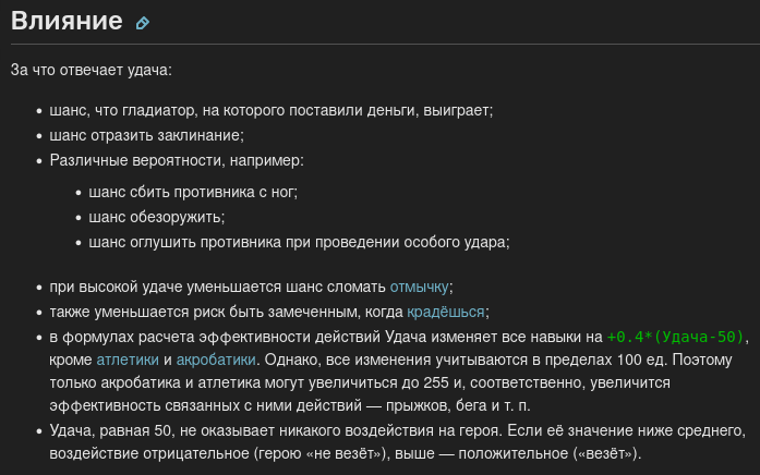 — Формула урона имеет непосредственно вычитаемый компонент, то есть если меч выкрутил ImpactForce, противник получает урон Max(0, ImpactForce − ArmorReduction), имитируя то, что если скрести по броне вещами слабее её, ей ничего не будет. Меч, способный выроллить больше урона, лучше.