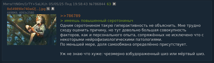 У людей есть жизнь за пределами имиджборд, по крайней мере обычно. Если мне скучно, то я прихожу сюда, но не нахожусь здесь постоянно. А кое-кто уже больше десяти лет каждый день здесь находится. Внатуре психотронная тюрьма.