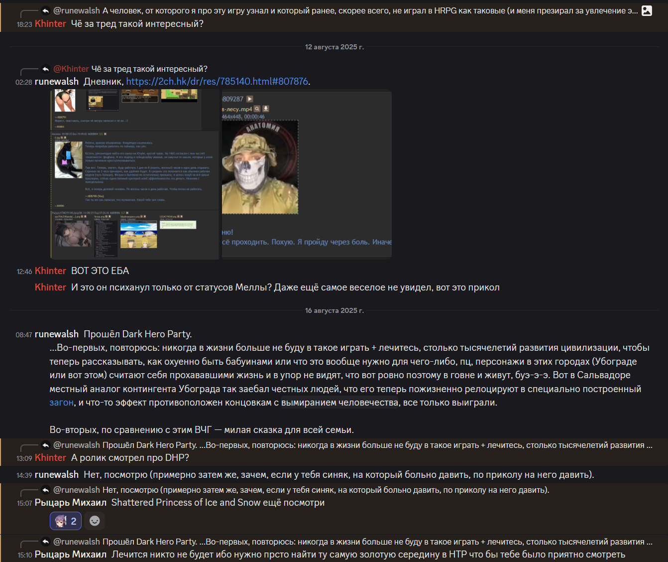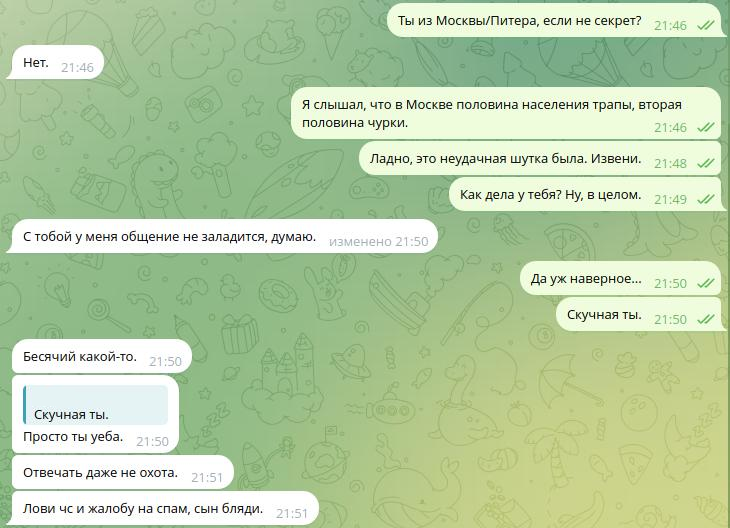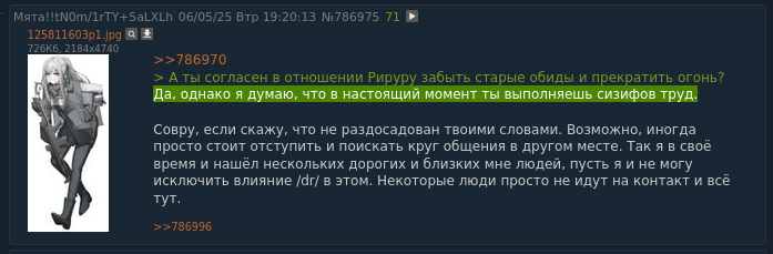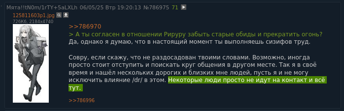Листая нулевую /dr, заметил странную вещь. Некто «Француз» в своём треде никак не отреагировал на пост Рируру, как будто бы даже проигнорировал. Два раза. Подряд. У меня плохо развиты эти ваши сошиал скилз, но... Разве не было бы логично ответить хоть что-то, ну хотя бы отшутиться. Да даже что-то в духе «Это не мои проблемы, сам разбирайся с Мятой» было бы лучше, чем тупой игнор. Возможно, он и написал что-то где-нибудь в тг или вк, я ж не знаю. Но если нет, то это выглядело как-то не по-дружески со стороны «Француза». Впрочем, мне-то откуда знать? У меня нет друзей. Даже в интернете.