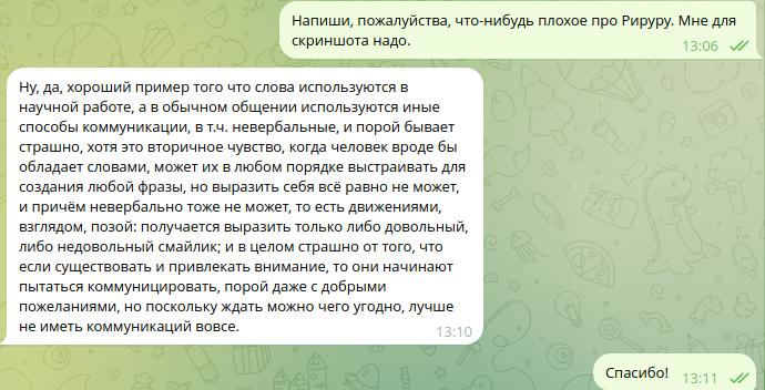 >>786434 Ответ на пост Рируру — это трата персонального времени Француза не на внимание ко мне, а на глуповатый байт. Игнорирование информационного шума, даже если ответ займёт всего пару секунд — показатель безразличия и/или неуважения в данном случае. И, в общем-то, всё правильно.