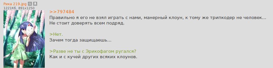 Должно, если это ты, то у меня возникают вопросы, в первую очередь, что едят правильные пацаны вместо ВКУСНОЙ ЕДЫ (известно, что: >>644764 →, но вдруг нет), а если это не ты, то какого хуя ты этого чмошника поддержал (тоже известно, какого: >>755656 →, но вдруг нет), ну и можно было бы ради интереса задать тот же вопрос насчёт еды, как к поддержавшему. Типа, художник должен быть голодным (в любом смысле)? Полная хуйня с единственной целью позволить убогим думать «зато он голодный».