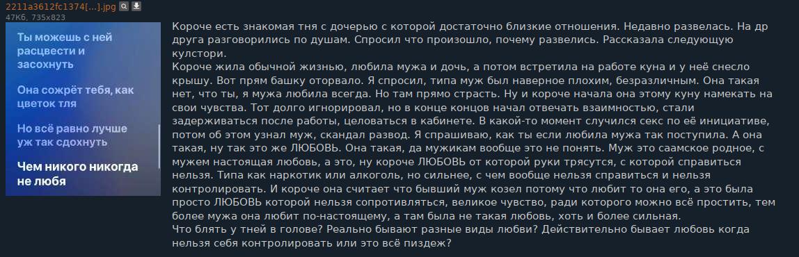 С погранцами (другой пример приводился, https://2ch.hk/dr/src/785140/17509519978361.png), как с наркотиками (https://youtu.be/m6KnVTYtSc0?t=178 2:58 — 4:34): хоть это и обман, а ничего лучше в твоей жизни не будет и ты будешь вечно искать потерянный рай. Ну или они так думают. В действительности от «нормального человека» можно получить то же самое и это так-то поприятнее будет, но глупо спорить с тем, что это гораздо сложнее. Что продолжает параллель с наркотиками.