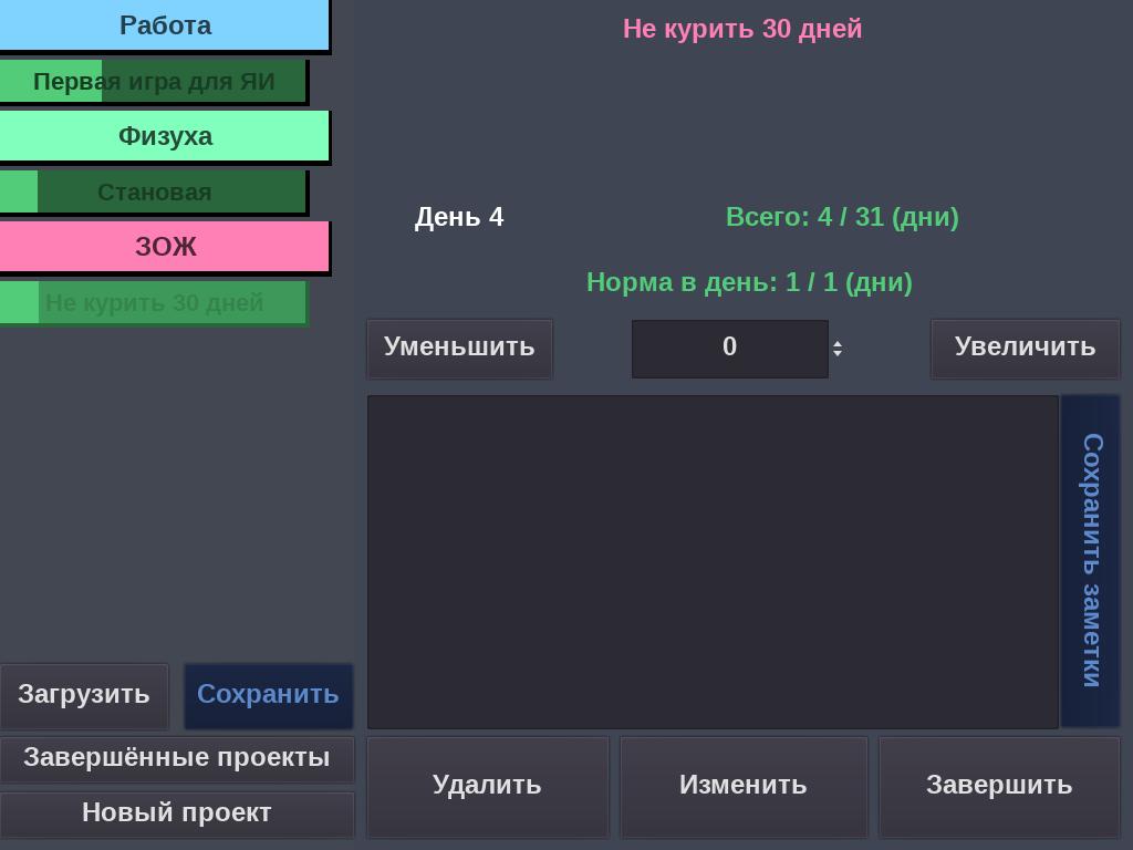 - Не курю 30 дней; - Работаю по 6 часов в день 5 на 7; - 2 тренировки в неделю.