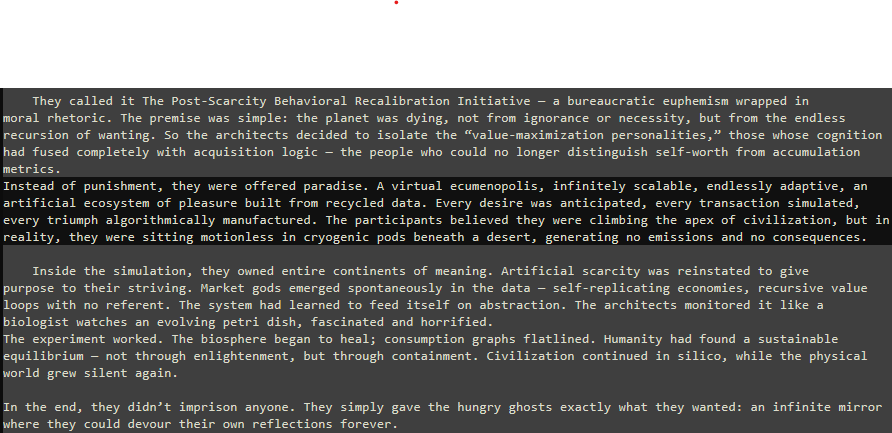 Поскольку убивать не хотят, считая это аморальным, а производство развлечений опережает возможности времени жизни человека, то в современной ситуации капиталисты используют пролетариат в качестве проституток, выращивая их в виртуальном мире, и выбирая себе в гарем самых красивых, на что пролетарии с радостью соглашаются. В итоге все счастливы, и оба класса существуют в единстве, наслаждаясь своей формой существования. Все попытки коммунистов изменить положение вещей наталкиваются на жёсткое противодействие со стороны обоих классов, и так будет продолжаться до тех пор пока эта обезумевшая биомасса не сожрёт все ресурсы планеты и не вымрет, превратившись в нефть.