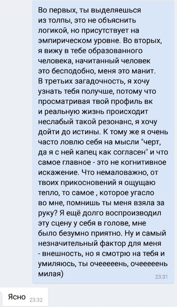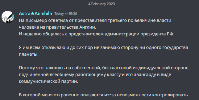 Если бы в институте серьёзно восприняли мою просьбу об экстернате(я не хочу тратить ни время ни деньги на полноформатное обучение), то возможно всё сложилось бы иначе, но здесь, опять же, попытка управлять и инфантилизировать: как будто не может быть такого что человек может функционировать полностью самостоятельно, опережать свой видимый возраст и не иметь при этом никого за собой, кто бы направлял и говорил что делать - тот самый принцип самостоятельности, почву для которого и предоставляет жизнь в Англии. Могу лишь предположить что источником этой ошибки стало знание об устройстве власти в России как о власти худших людей, а так же и о знании об их производстве, когда человеку уничтожают самосознание и помещают в текстовую коробку, в которой каждое его действие становится прогнозируемым исходя из помещаемого в эту коробку текста, что и есть воплощение биологического автомата. Но по какой-то причине мой вкус, то есть то что мне нравится и в чём я нахожу параллели с собой, воспринимается как непосредственно отождествлённое со мной, как будто самой меня не существует и никогда не существовало - я уж не знаю сколько ещё нужно этим самым меня доводить, что я уже на стенах начала писать "I exist", чтобы от меня отстали и перестали преследовать.