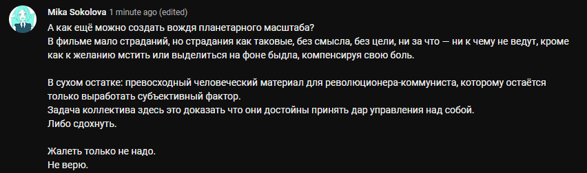 Когда люди сообразят насколько убога их форма существования не где-то там абстрактно, а прямо здесь и сейчас, в момент чтения этого текста, и осознание это будет не индивидуальным а массовым, - тогда и можно будет говорить о коммунизме, о диктатуре пролетариата и о прочих подобных безусловно приятных вещах. Старый же человек не может придумать ничего другого, кроме как пытаться выстроить ещё один цивилизационный конструкт хорошего отношения людей между собой, просто потому что они существуют - меняться он всё равно не станет, потому что как это типично для бужуазии, слова у него впереди дела.