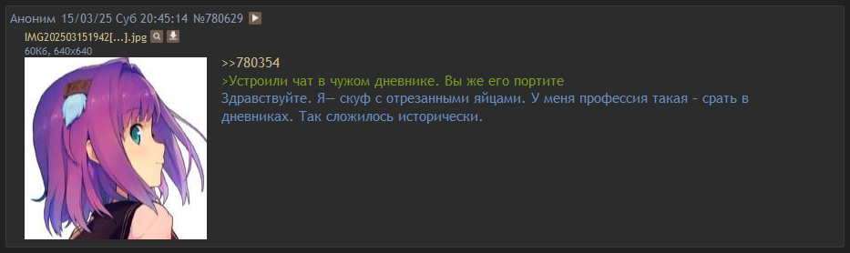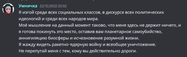В 21 веке нет вообще никакого смысла в том чтобы пытаться управлять людьми или искать внимание, тем более в интернете. Всё что здесь будет сказано и написано, будет использоваться только лишь как еда и средство удовлетворения, энергия от чего будет растрачена на глупые видеоигры, на походы в качалку, на общение о том о сём, - любой инфлюенсер это не более чем контент под чипсы, поэтому я взаимодействую с обществом не в крупнейшей социальной сети, а на мёртвом разделе устаревшего форума - просто чтобы был сам факт взаимодействия с обществом, с минимально возможной вероятностью быть замеченной.