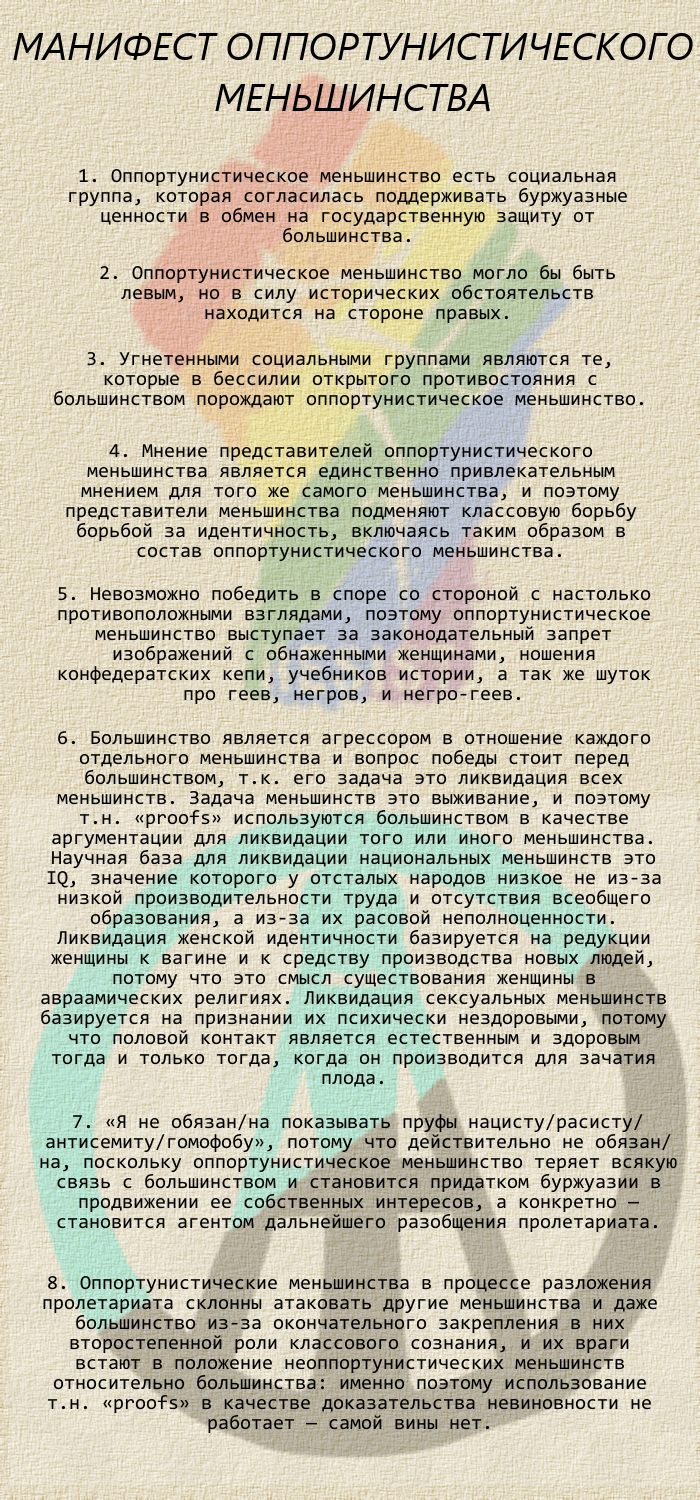 Задача же не в том чтобы схватить умственно-отсталых андроповцев и разоблачить их систему перед всем миром - это был бы неправильный, космополитический подход. Задача в том, чтобы научить русские и белорусские массы бороться и победить и свергнуть власть эксплуататоров и их подчинённых паразитов - для себя-то лично я уже победила и всё сделала, всего добилась, и мне уже всё равно, потому что у меня всё есть: хоть на танках в Париж едьте, хоть поубивайте все друг друга. История начнётся если общество обретёт самосознание, но может и не обретёт. В КНР я ещё, например, не жила - может мне там и работа какая найдётся ;)