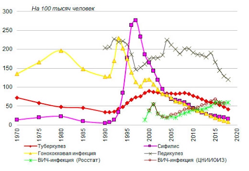 В начале периода реставрации капитализма в СССР начинается рост подобной всеобщей заболеваемости по многим показателям, включая в себя не только злоупотребление влияющими на психику веществами, но и рост венерических заболеваний, и прочих заболеваний, передающихся при близком контакте человека.