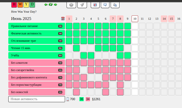 Итоги 1 июля: Моя семья дала мне шанс, вернее только мама и бабушка, папа меня ненавидит, с дедом думаю смогу отношения восстановить. Если я изменюсь за эти 2 месяца и превращусь в нормального человека который может взять ответственность за свои действия и стану дисциплинированным, то может я даже смогу платно, но последний год отучиться и таки получить диплом. Со своей техвышкой мне будет в разы проще найти работу, даже в программировании. Я же смог поступить, значит я чего то и стою. Жаль что я пришёл к этому только спустя 7 лет. Сегодня я начал делать домашние дел, которые не делал раньше: помыл посуду за собой, убрал лоток у кота, перебрал вещи в ящиках(нашёл коробку с пишущими ручками что приятно). Завтра сделаю дома что нибудь ещё, думаю пропылесосить и вытереть пыль. Так же сегодня я снова начал заниматься спортом, сделал 25 отжиманий, 40 сгибаний на пресс и 25 приседаний. Так же час гулял в лесу, хоть и погода плохая в дс, но это помогло освежить голову. Завтра тоже погуляю, но уже с шагомером. Нашёл свою табличку которую я оказывается раньше вёл, опубликую её тут, если кто захочет сможет отслеживать как я работаю над собой.