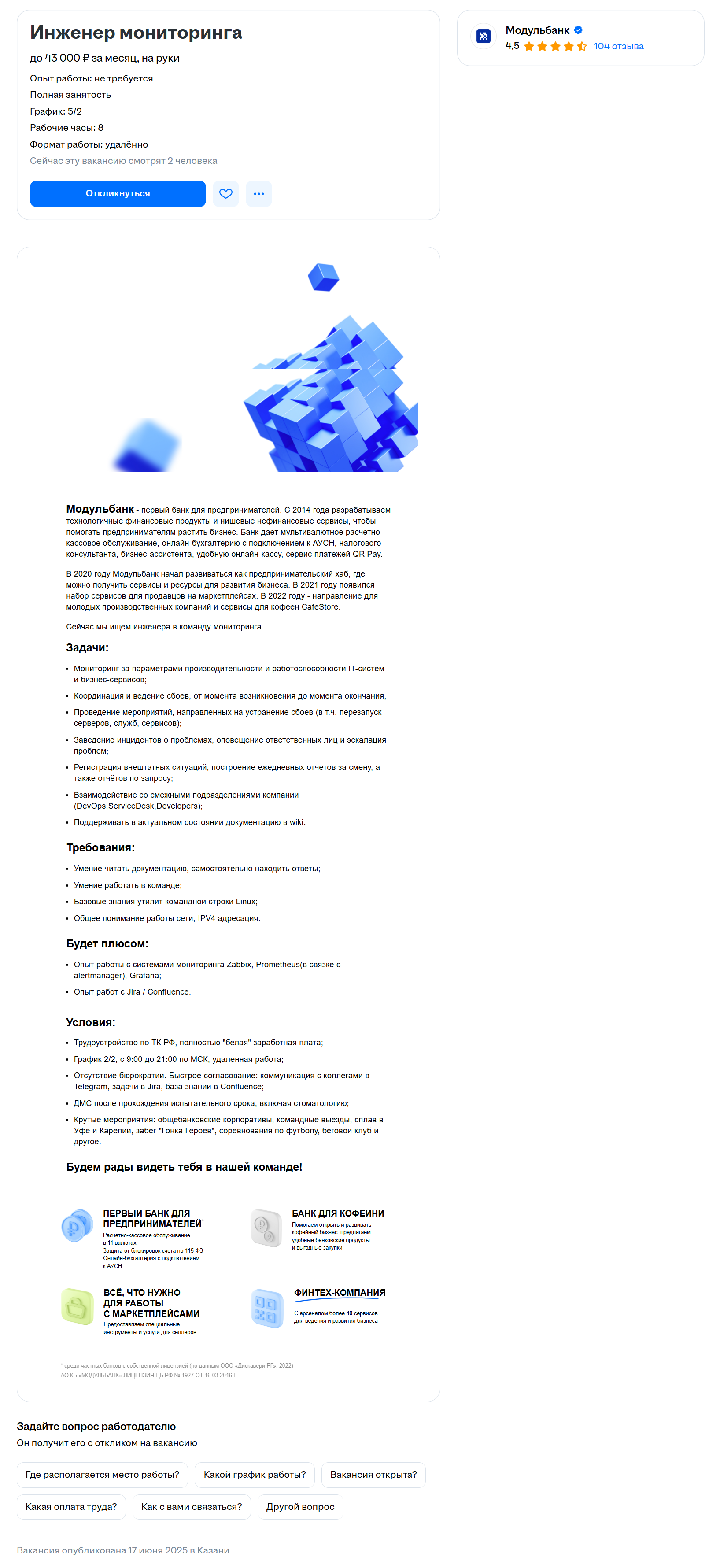 Всё думал об этой вакухе. Требования низкие, зп низкая соответственно. Я подумал, что если я не смогу заставлять себя учиться в выходные дни хотя бы по 2 часа каждый день, то я навсегда останусь в мониторинге с копеечной зарплатой.
