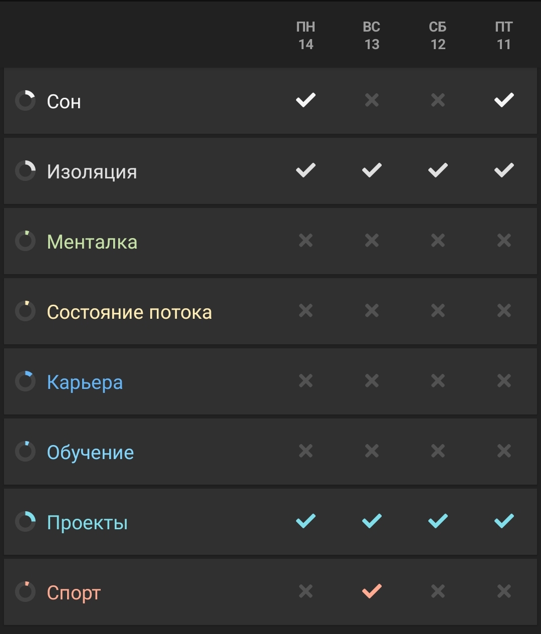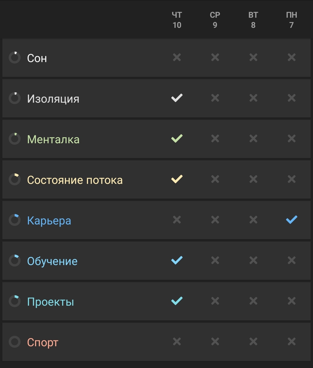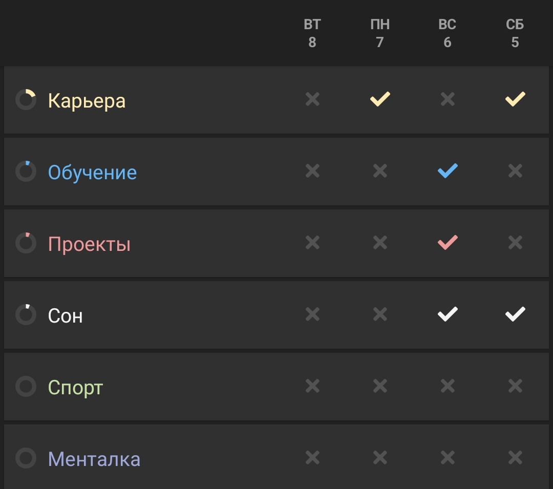 2) Направления усилий которые дают реальный результат: • Карьера - какие-то краткосрочные задачи, которые не приносят прямого профита, но они необходимы. По сути на них уходит большее количество сил, было бы несправедливо это никак не учитывать. Вот например проработал я с утра до ночи - от этого ничего не поменяется, всем плевать на твои усилия и отдачу, но по сути как-то ты свои навыки улучшил, опыт прибавился, денег за это получил - это тоже чего-то стоит. 2) Обучение - это уже развитие навыков или экспертизы в чем-то на перспективу, возможно это даже не понадобится, а может быть кардинально все поменяет в будущем. 3) Проекты - это работа над достижением какой-то конкретной осязаемой цели.