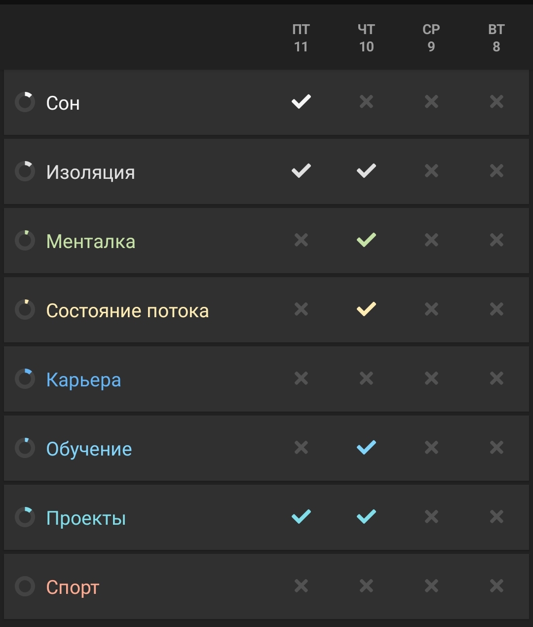 Карьера: 3/7 Это была неделя работы, четко осознал, что лучше делать все сразу ибо потом лишний раз стрессуешь. Пока не тянет доделать скринер, и учить тоже ничего не хочется, сейчас на работе начинается сложный период, отпуск закончился. В плане понимания процессов стало чуть лучше, мои профессиональный навыки растут, но они все равно ещё недостаточны, чтоб за счёт них перекрывать дебафы. Социальное взаимодействие очень тяжело, если прогресс и есть, то он незаметен. Пока работаю от дедлайна к дедлайну, даже если есть важное - я откладываю на самый конец. Я столько планировал сделать в эти недели, да даже на выходные, а в итоге лишь самый минимум - так точно не пойдет.