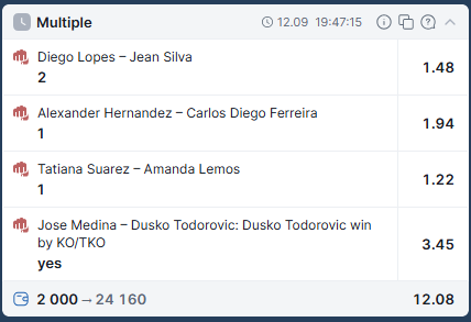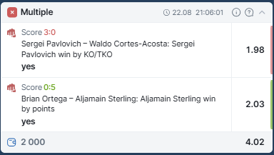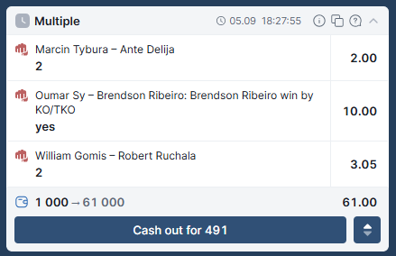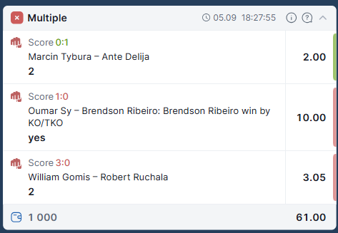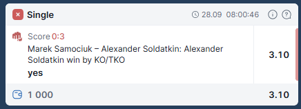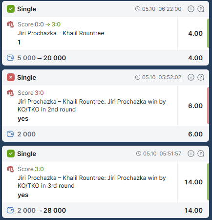 Экспрессы не залетают. В голове я постоянно прокручиваю мои упущенные шансы и это всегда ставка на одного бойца с результатом, который никто кроме меня не видел. Никто не видел Мераб побеждающий Умара решением, никто не видел Хамзата побеждающего Дрикуса решением. На них были отличные каэфы, но я не могу заставить себя зарядить серьёзную ставка на один бой и отбить свои деньги, я хочу зарабатывать много и ставить мало, но это просто не работает. Сработает ли этот ? Я не уверен.