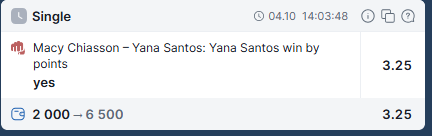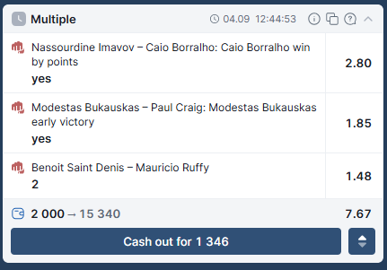 Первая ставОЧКА, чувствую себя очень уверенно по поводу: 1.Кай-левша решенатор, что лучше как атлет с лучшим кардио и граплингом, выходит против бойца, что ничего кроме джеба и 1-2 не умеет, при этом имеет тенденцию сдаваться, если бой становится слишком тяжёлым. Он чуть не проиграл Долидзе из-за этого и это после 10-8 в первом раунде. 2.Пол Крейг не сможет выстоять 3 раунда против любого оппонента способного выбросить удар. Его единственный путь к победе-это саб, но он не может бороться. Можно было ставить на нокич или первый раунд, но зачем рисковать, когда 1.85 ставочка на экспрессе и так хорошо сморится? Если выиграю рано перед боем занесу отдельную на особый финиш. 3.Я уверен в победе Руффи, Бенуа давно достиг своего потолка, проблема в том что я не уверен в том как Руффи победит, поэтому ставлю тока на победу.