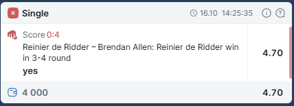 Провал колоссальный, но достаточно странный, я корректно угадал 8/13, но из 5, что идентифицировал не правильно, 2 были предвиден и сгруппированы в один экспресс, чтобы в случае чего ничего не испортить. 3 были неприятны, но не фатальны, что уничтожило меня, так это ставки на результат, я угадал только 2 и из 13, потому что на всём карде 11 финишей. То есть мои ставки одна за другой не смотря на то, что я знал победителя оборачивались провалом, потому что я не верно указал как скоро они победят.
