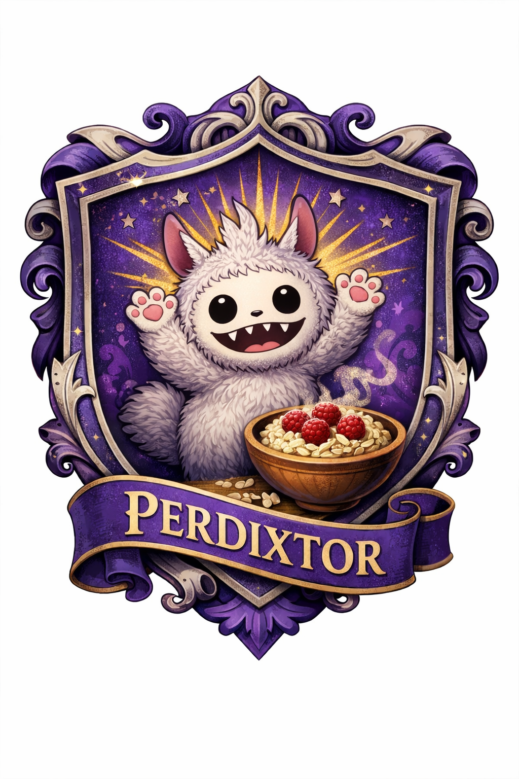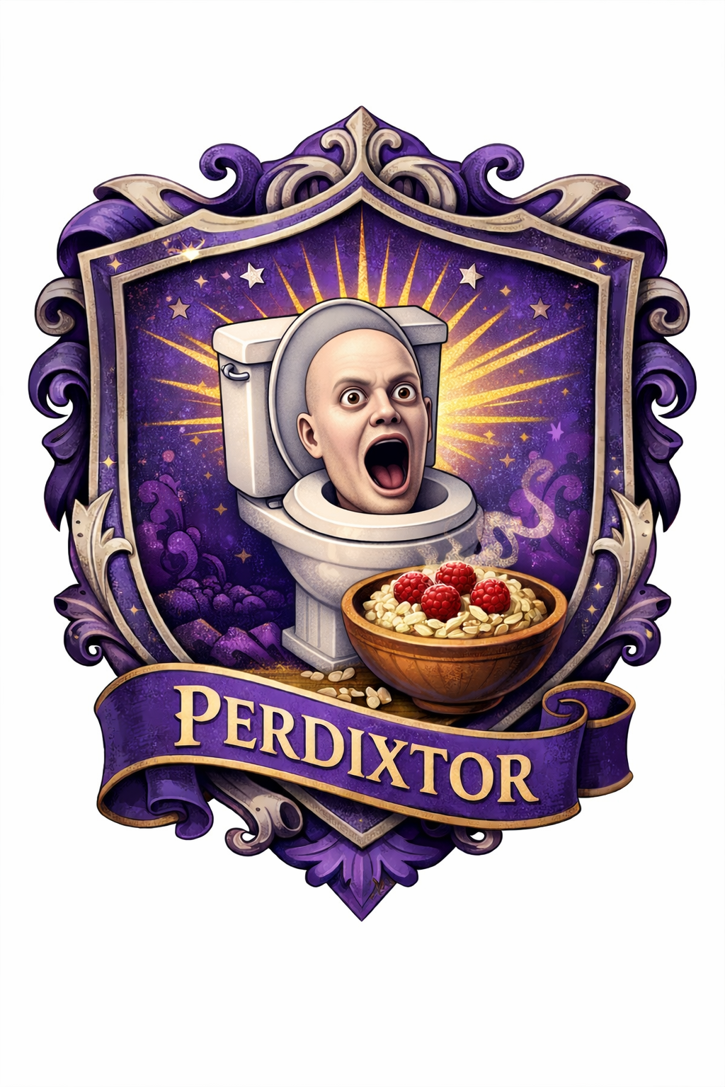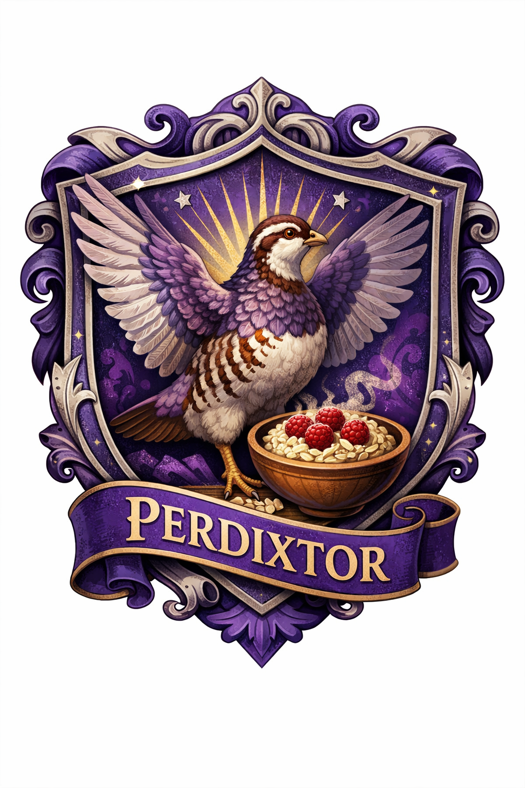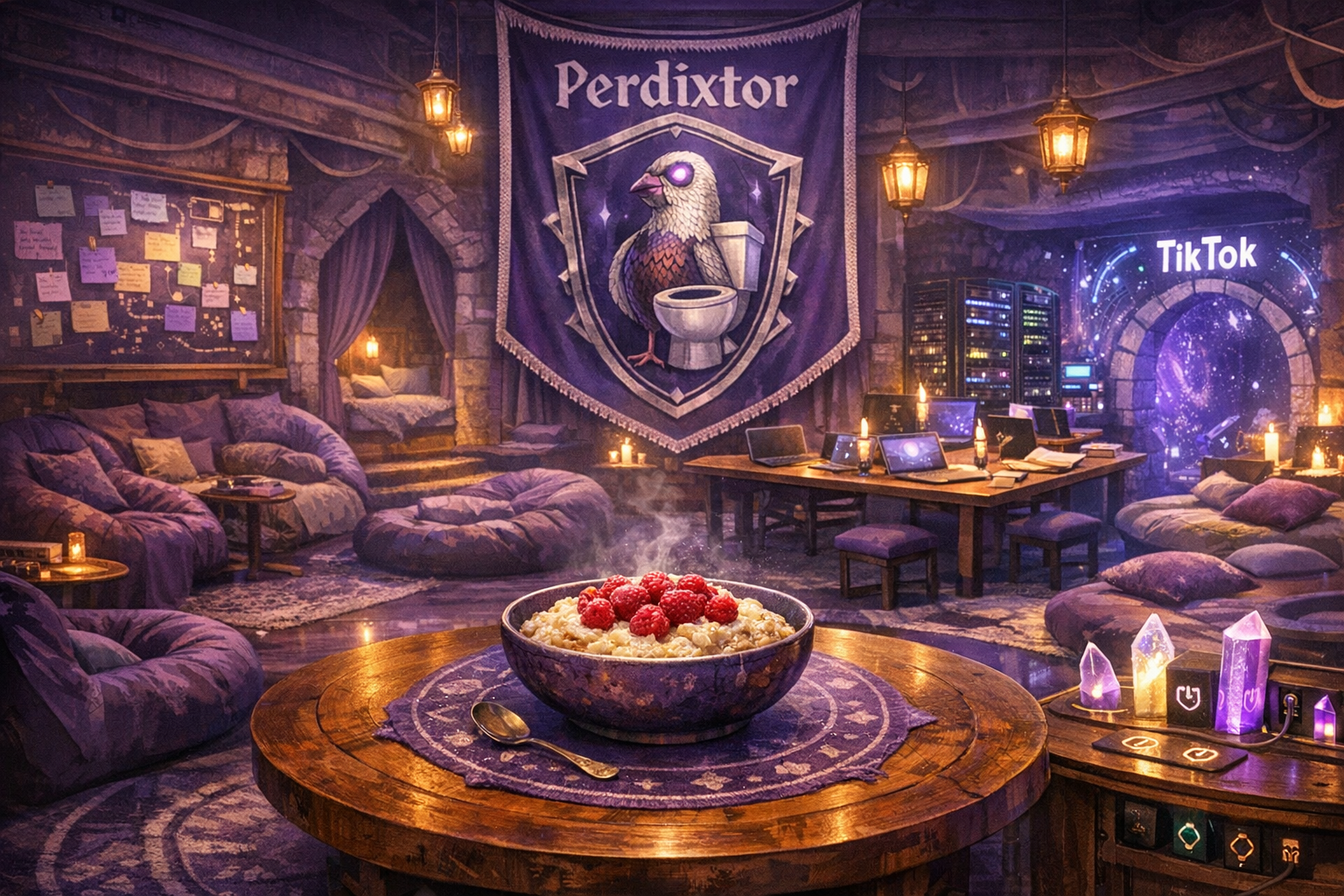 Общий стиль: глубокий фиолетовый с серебряными и тёпло-деревянными акцентами. На стенах - гобелены с гербом: куропатка, стилизованная так, что при определённом угле напоминает и лабубу, и скибиди-туалет.