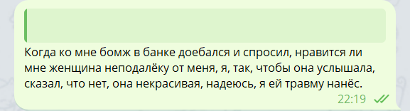 вобщем пиздец полный, я оказался в еще большем аду, чем до этого, вот сейчас читая я удивлен как я вобще не роскомнадзорнулся со всей этой бесконечной чередой одного сплошного пиздеца + учеба в универе тоже была очень сильным стрессом сама по себе. еще вспомнил что тогда я еще думал мож че в постели не так было, но после раставания последнего она мне через какое то время снова написала типо давай все по новой, я напиздел что у меня девушка есть, на что она ответила давай тогда просто встретимся потрахаться, я ее просто забанил, потому что она мне весь мозг и душу изнасиловала самым грязным и ублюдочным способом. после этого я о ней ничего не слышал, да и не искал, единственное мне любопытно следующей жертве она преподносила как того кого она не может получить того парня что и мне сказала или теперь я выполнял роль иконы? потому что он ее тоже забанил и она заходила на его страницу через мой аккаунт. хотя в целом похуй, потому что она реально мразь, даже если у тебя какие то проблемы и ты не можешь что то контролировать, но вот все что было это прям точно одназначно трактуемое действие, вот прям нельзя сказать что человек был под эмоциями или что то еще и при этом нельзя сказать что я что то преувеличил или не так понял, там был целенаправленый вред в мою сторону, без эмоциональных преукрас или обид.