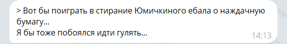 Это самый безобидный момент без явного стремления меня обосрать (в отличие от последующих), человек по сути просто эмоционально выразился (по крайней мере можно так интерпретировать), но задним числом уже как-то неприятно. Если же на тупорылых дрочеров пытаться отвечать... Ну вот я Хаксплаксу однажды на выпад, по формальному содержанию уже близкий к трапу в боевом кураже, ответил вторым видео, он и Ария ответили, что ну и мерзость, он же пошутил, ну и всё на этом, помахались и разошлись. Это нормальная реакция. У Юмасика при попытке, даже не как-то так симметрично ответить, а просто что-то пискнуть против, происходит то, что описано на этой картинке: https://2ch.life/dr/src/815928/17593477825711.png, в абзаце, начинающемся с «у многих прлок, как и у меня, кптср, на импульсы не отвечайте агрессией...». Ну блин, идея хорошая, только я ещё по воде ходить не умею и воду в вино превращать тоже.