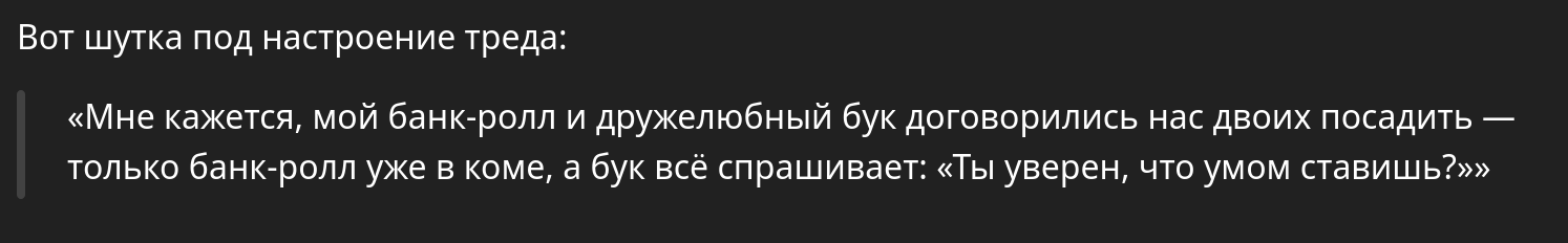 бывает валяю дурака, но это чтобы с ума не сойти. ставлю ставки с 2012 года почти каждый день. представьте, каково это. я уже в край одебилил