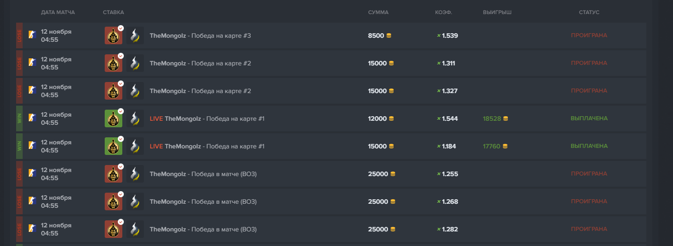 я снова проиграл весь свой баланс на Монголах. сука! против Пейшон! Пейшон! они с Айболерс играют 2-1. проиграл со счета 1-0! когда кф был 1.065 на вторую карту, а ставки на матч закрыты! жесть! 13-11 две последние карты. не верю! они специально слили. специально, это трёха. не верю. не может быть. Блитц специально слил. у него друг Сензу лудоман, он попросил. невозможно