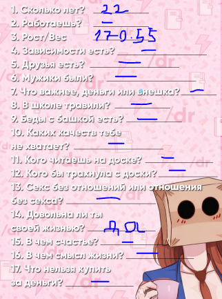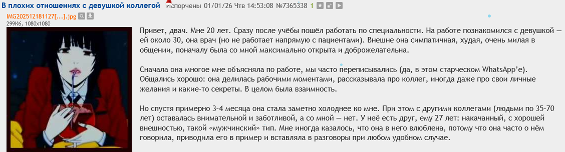 Из последнего разве что на девчонку из другого дневника немного быканул но честно говоря мне кажется что там какая то тупая манда которая пришла на доску за валидацией своих проблем поэтому это не считается