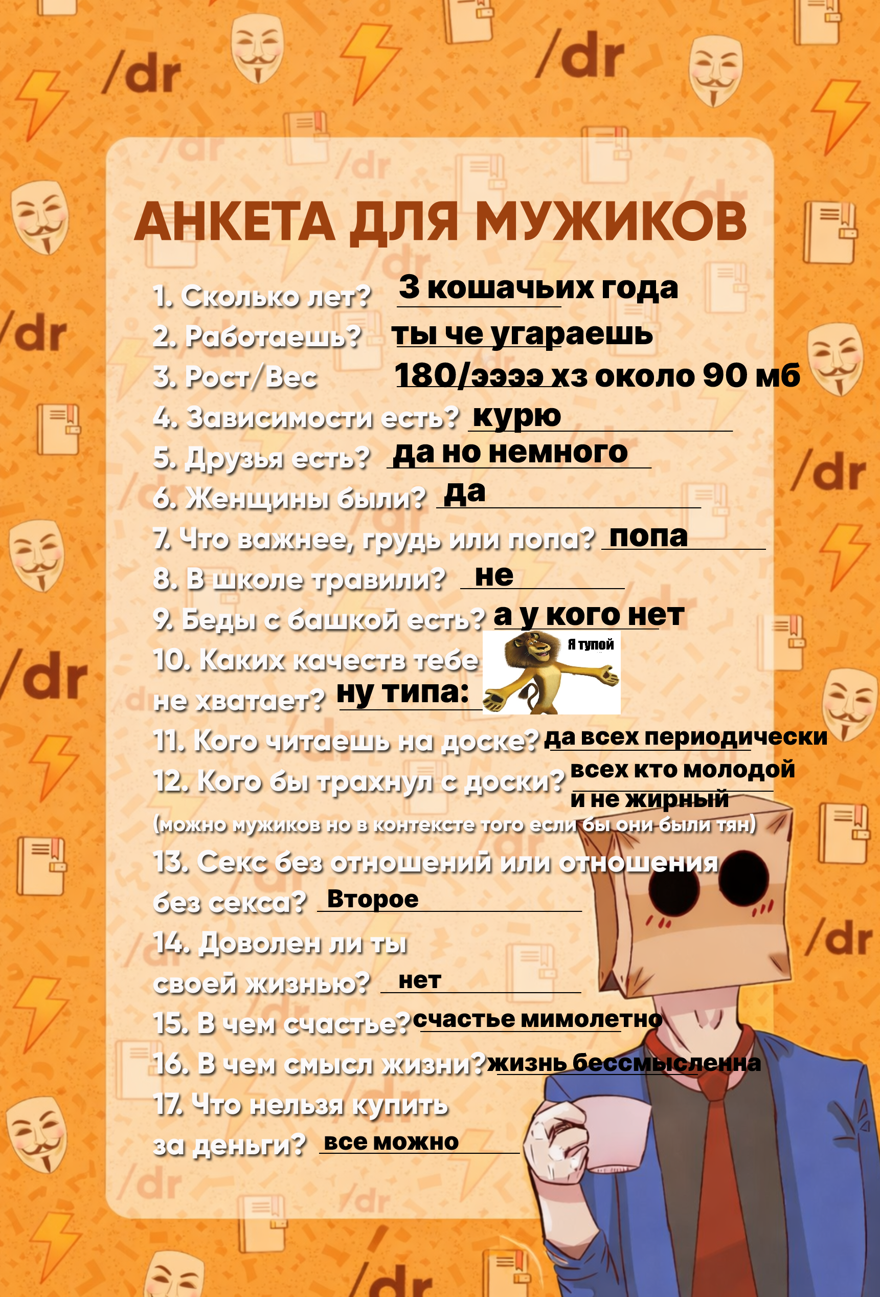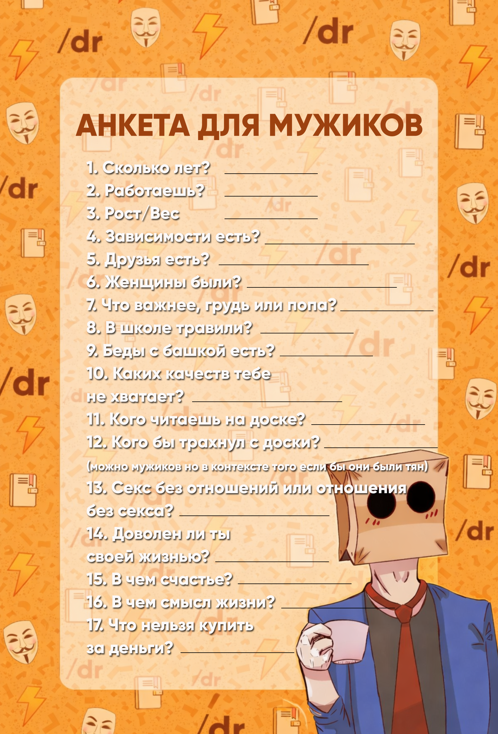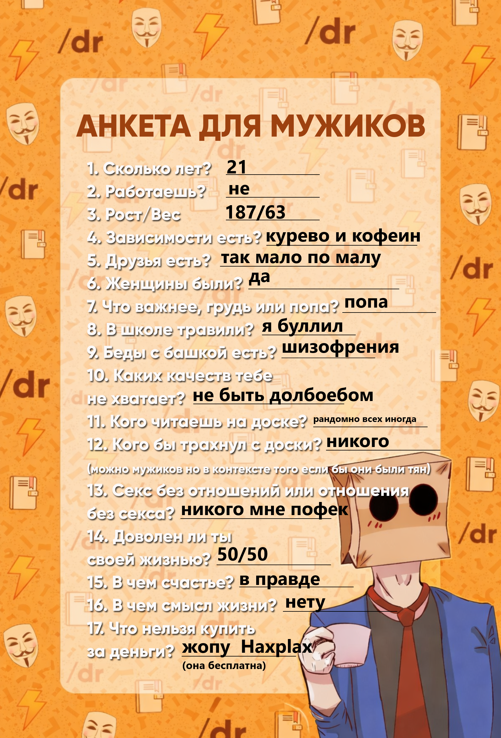 А можно мне позвать кого-то не из /dr? Основная идея собрать людей именно с данной доски, но если человек адекватен, то можно. Но только если ваш знакомый не застрял где-то в 2010 и он до сих пор считает что все двачеры омежки, перед которым он будет агрессивно двигать тазом и рычать. В таком случае не стоит.