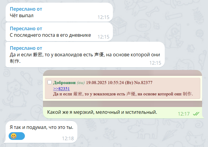 Как-то я с неудовольствием заметил, что мои посты в одном из дневничков Кусоха-доно на доброчане как-то очень быстро исчезают, и это были не объяснения в его стиле «вы и ваша жизнь говно, мне глубоко насрать на вас, напоминаю, а то уже полчаса прошло и вы, поди, забыли» (благо на ОП-модерируемой доске такое малоперспективно...), а абсолютно безобидные вещи типа второго пика. По ощущениям, пост мог прожить считанные секунды. Я даже чуть не подумал, что словил шедоубан, настолько самоотверженно человек сидел и дежурил посты с намёками на иронию, оффтоп, что угодно, что хотя бы гипотетически можно проинтерпретировать как ЗАДЕВАЮЩЕЕ его высочество. (А потом этот же человек мне будет рассказывать, должно меня или не должно что-то задевать, угу-угу. Наверное, мне надо тоже вместо милых шуток про замену «сейю» на «声優» выдавать милые шутки про необучаемых скуфов-пидорасов с трёхзначным весом.)