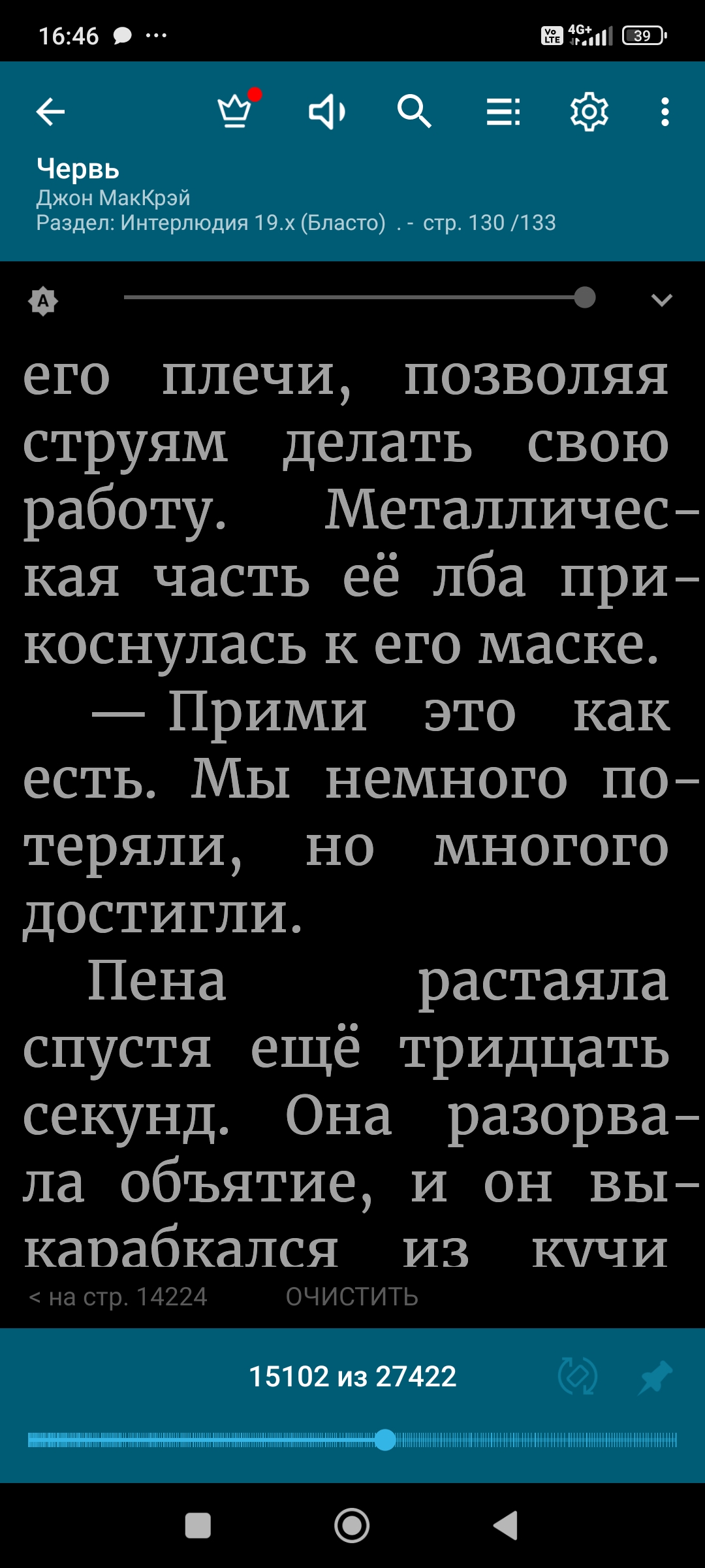 Добил червя. Заебался пиздец. Если кто - то решит вкатиться - читайте медленно, смакуя. Я так не могу в связи с ситуацией. Последняя треть - перегружена деталями и в целом считаю концовку скорее слитой. Остаток дня занимаюсь скачкой фильмов, завтра - их просмотром. 1) Элизиум. 2) мультик с Сэмом Фишером. 3) Бегущий человек. Новый. 4) Мгла. Сериал, не фильм.