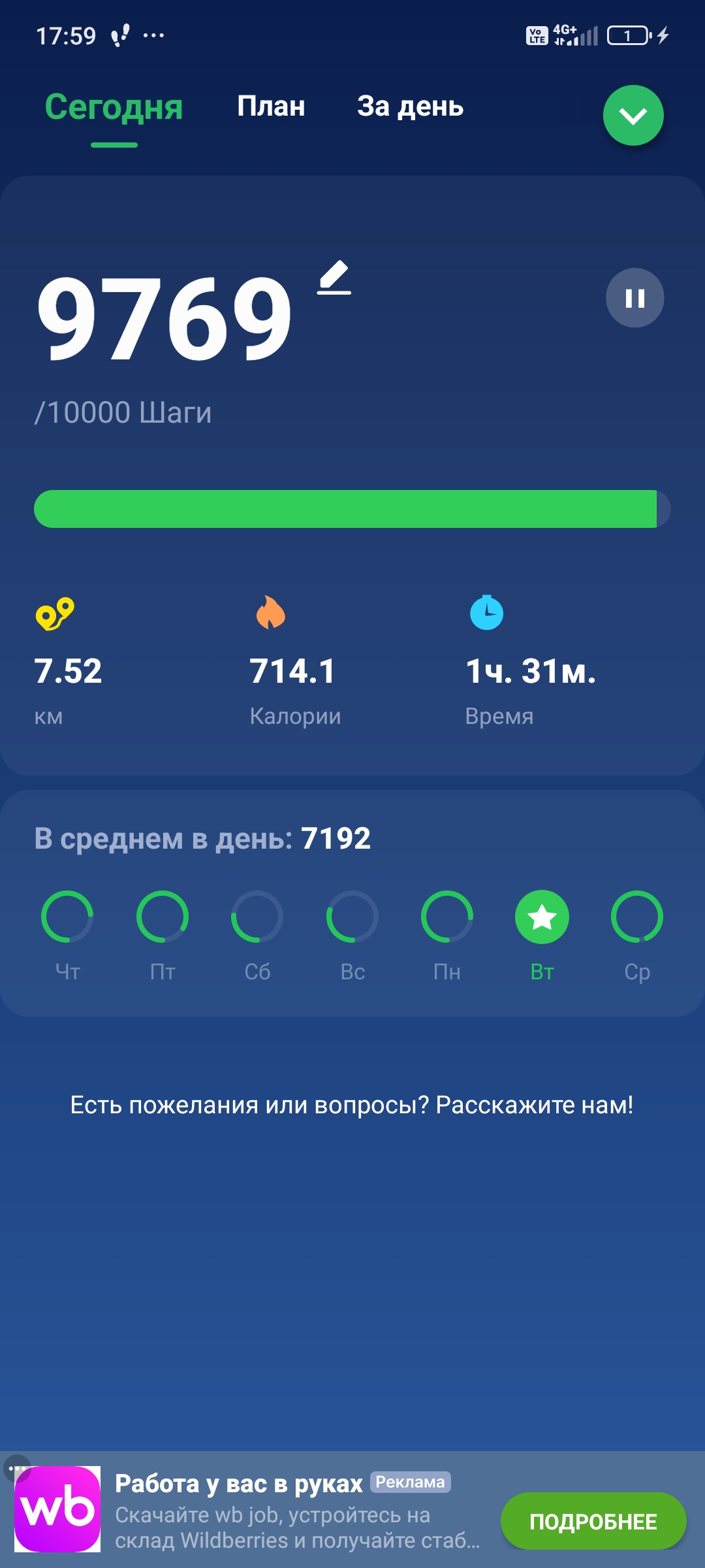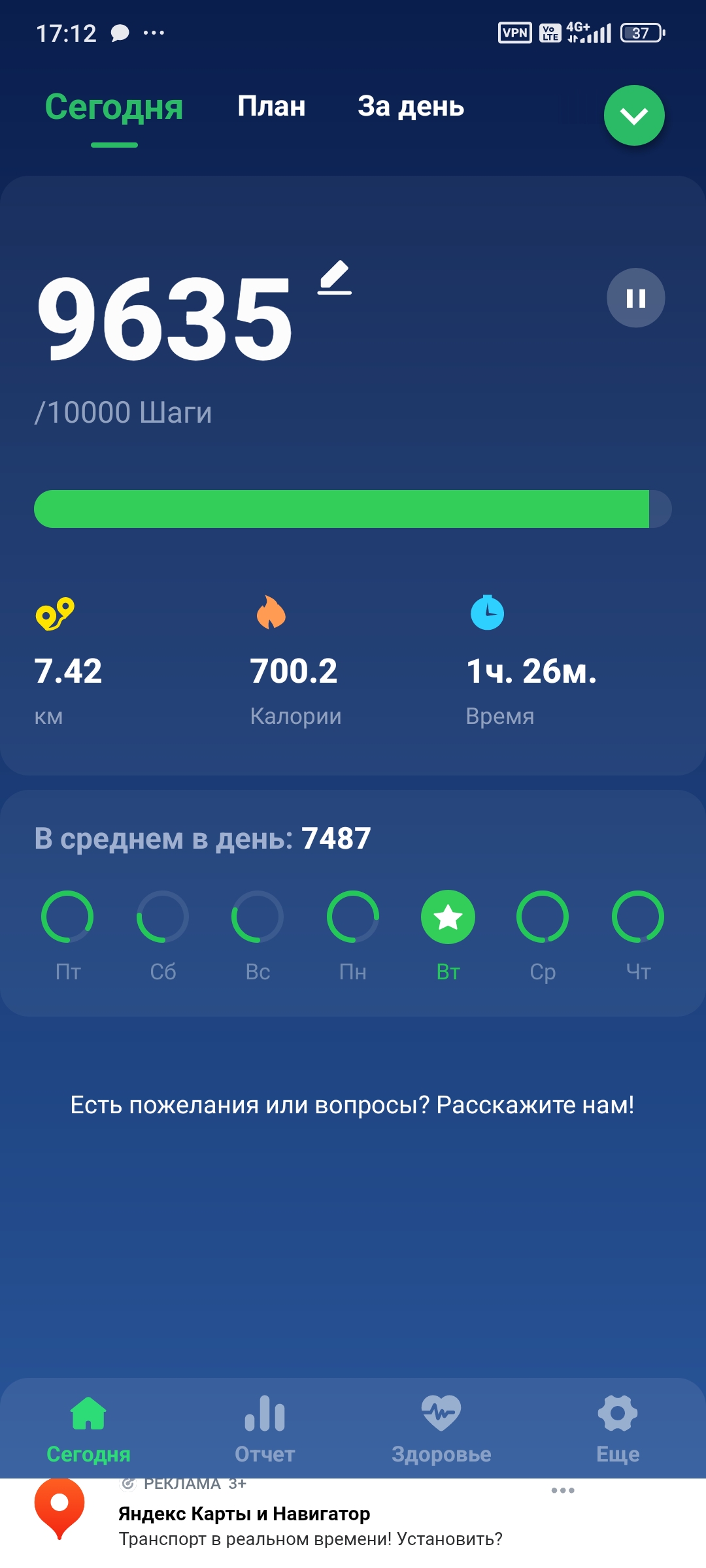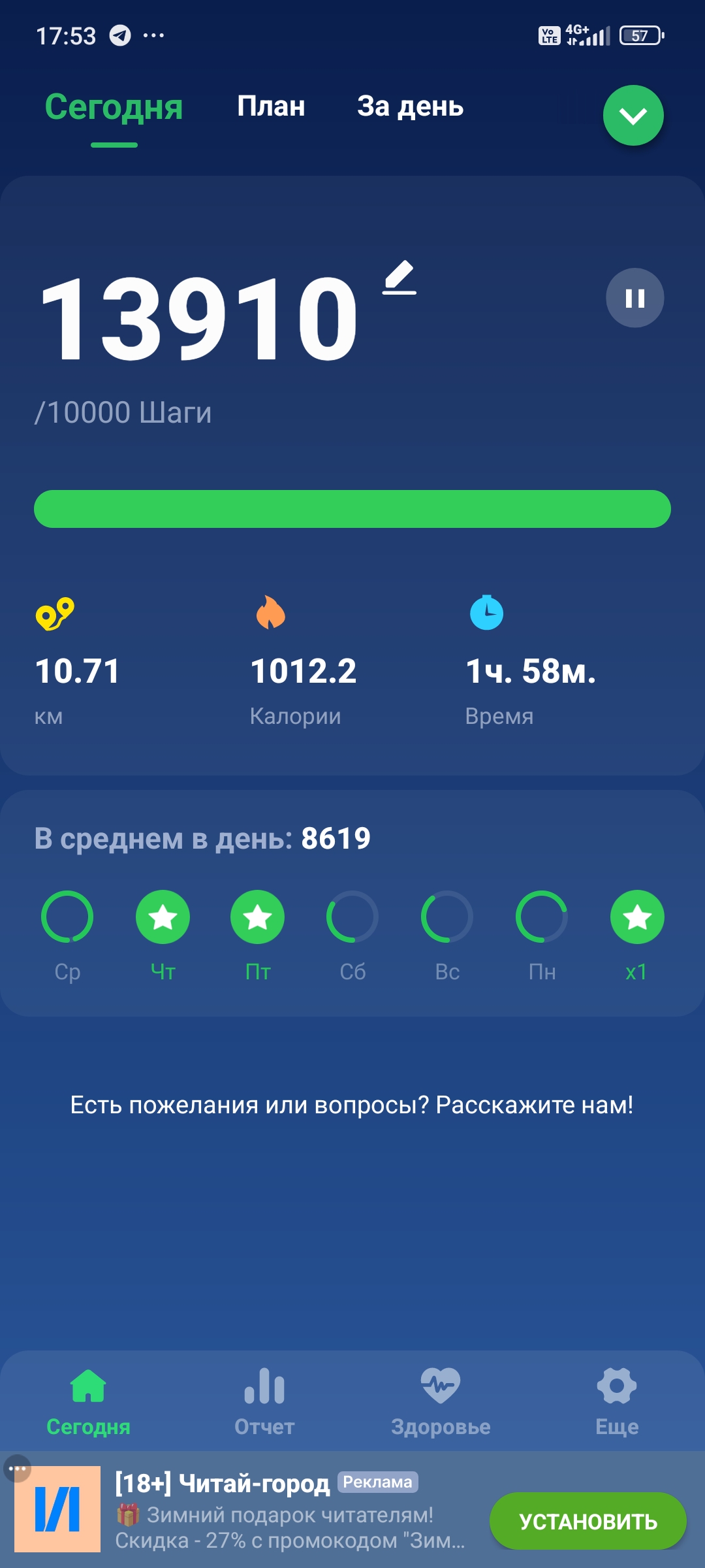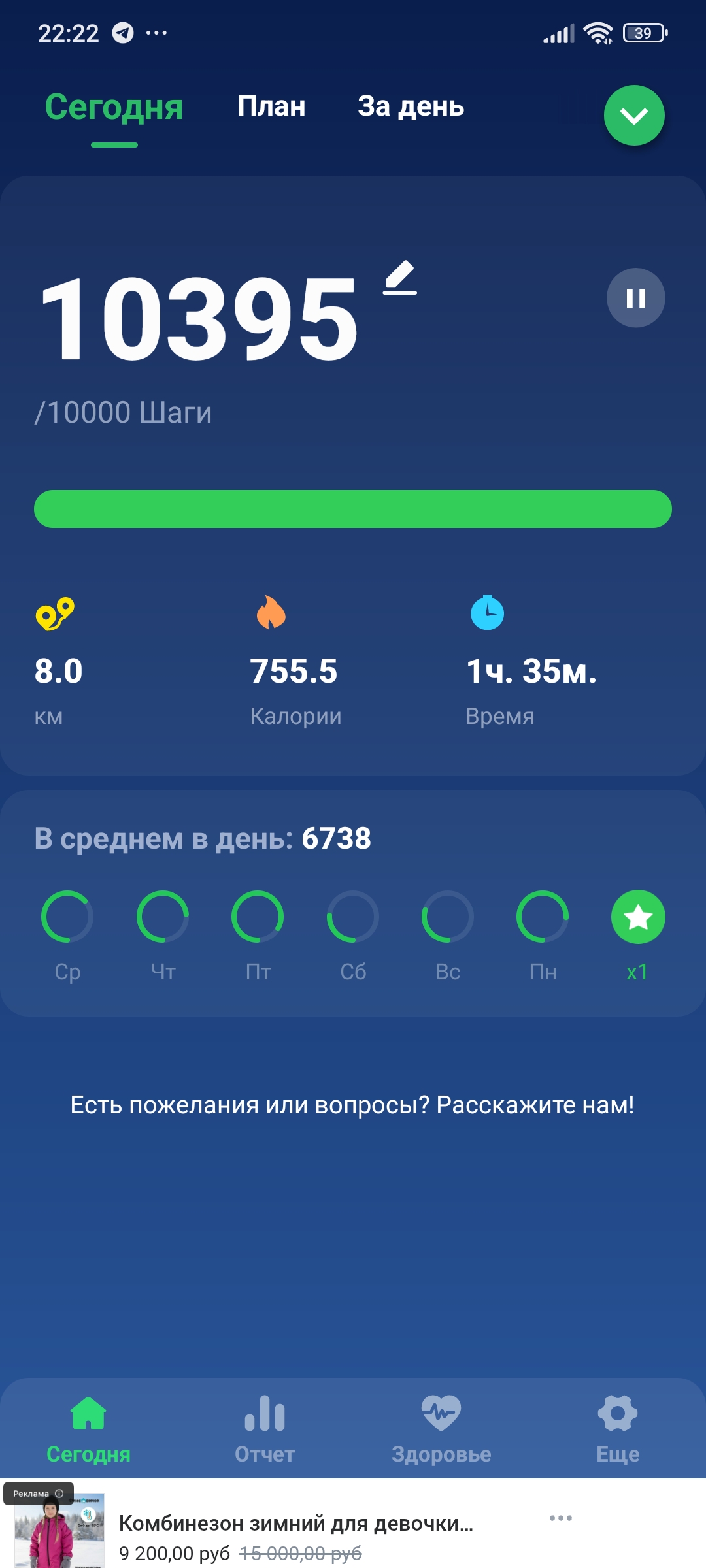 >>829249 Я вот тоже недавно приобрел привычку каждый день проходить одинаковый маршрут примерно в 6 км. Это как раз приблизительно 10 тысяч шагов или 1 час с небольшим суммарного времени нахождения на улице.