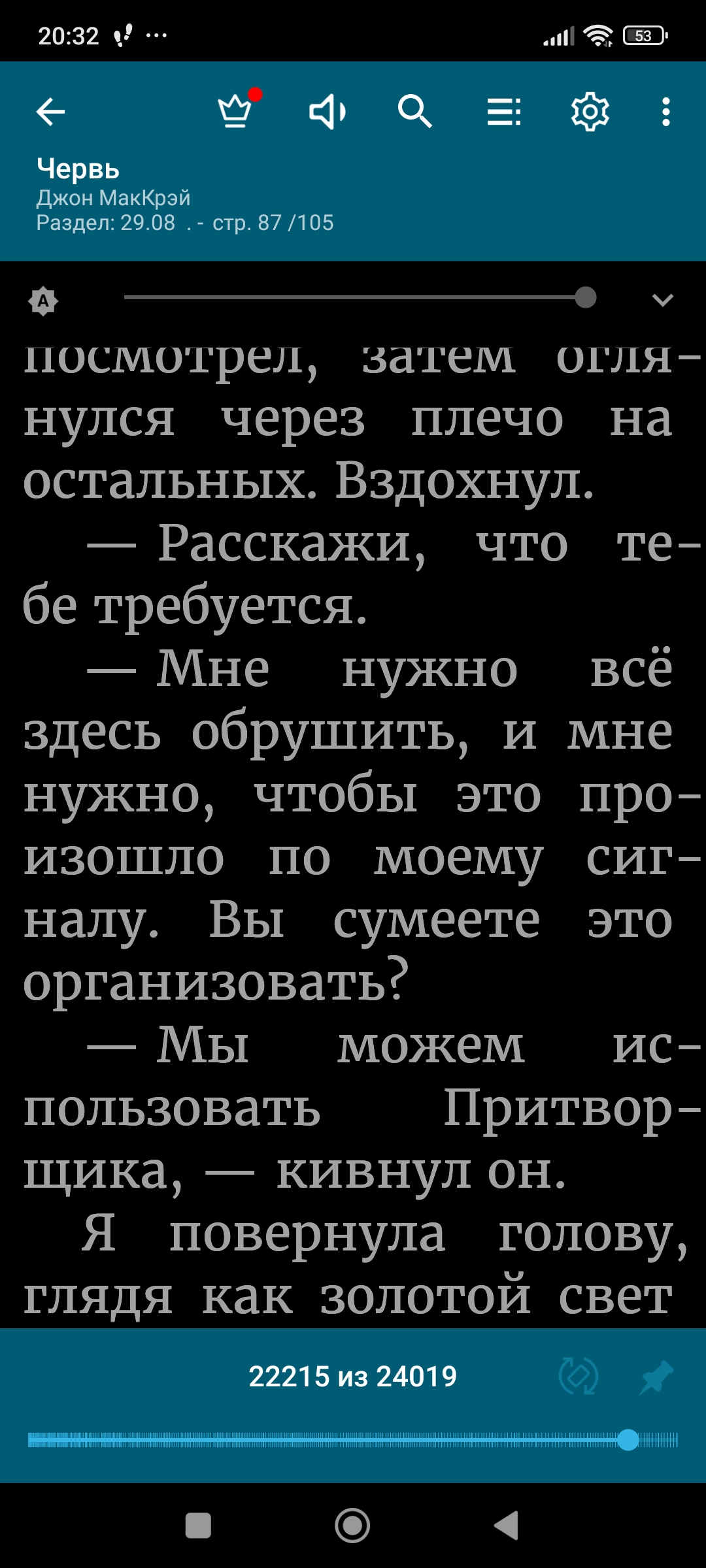 >>828649 Забыл добавить, так как постоянно отвлекаюсь на борьбу с тупостью. Ебанул аж почти 2000 страниц(!!!) червя. Также неплохую отечественную фантастику прикладываю - на удивление не хуже Ведьзмина , которого я не большой фанат.