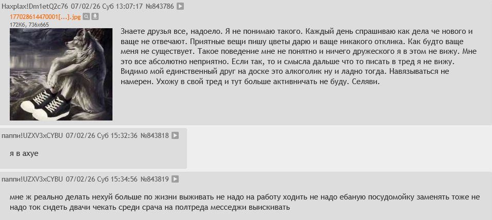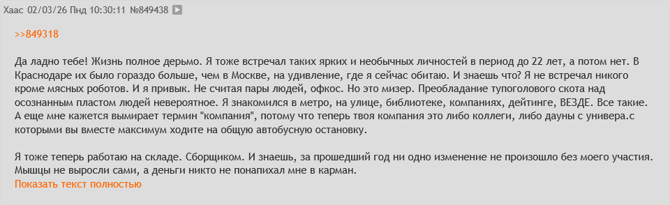>Ну типа, че после батрачки? Какая конечная цель? Ну, видосы записывай, там делай что вообще можешь делать. Это вообще то редкость когда человеку есть что делать. Со временем заёбываеь абсолютно всё. Выбор есть только между сдохни или умри. Наверное когда меня всё заебет я внатуре поеду в какой-нибудь тцк, французу бомбы на дрон закручивать. По сути ради этого мы и живём, только глубоко трусливые маньки это отрицают.